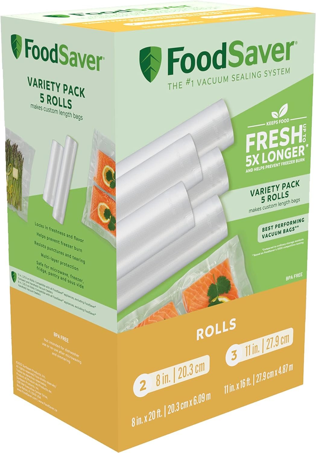 FoodSaver Vacuum Sealer Bags, Rolls for Custom Fit Airtight Food Storage and Sous Vide, 8″ (2 Pack) and 11″ (3 Pack) Multipack (Packaging May Vary)