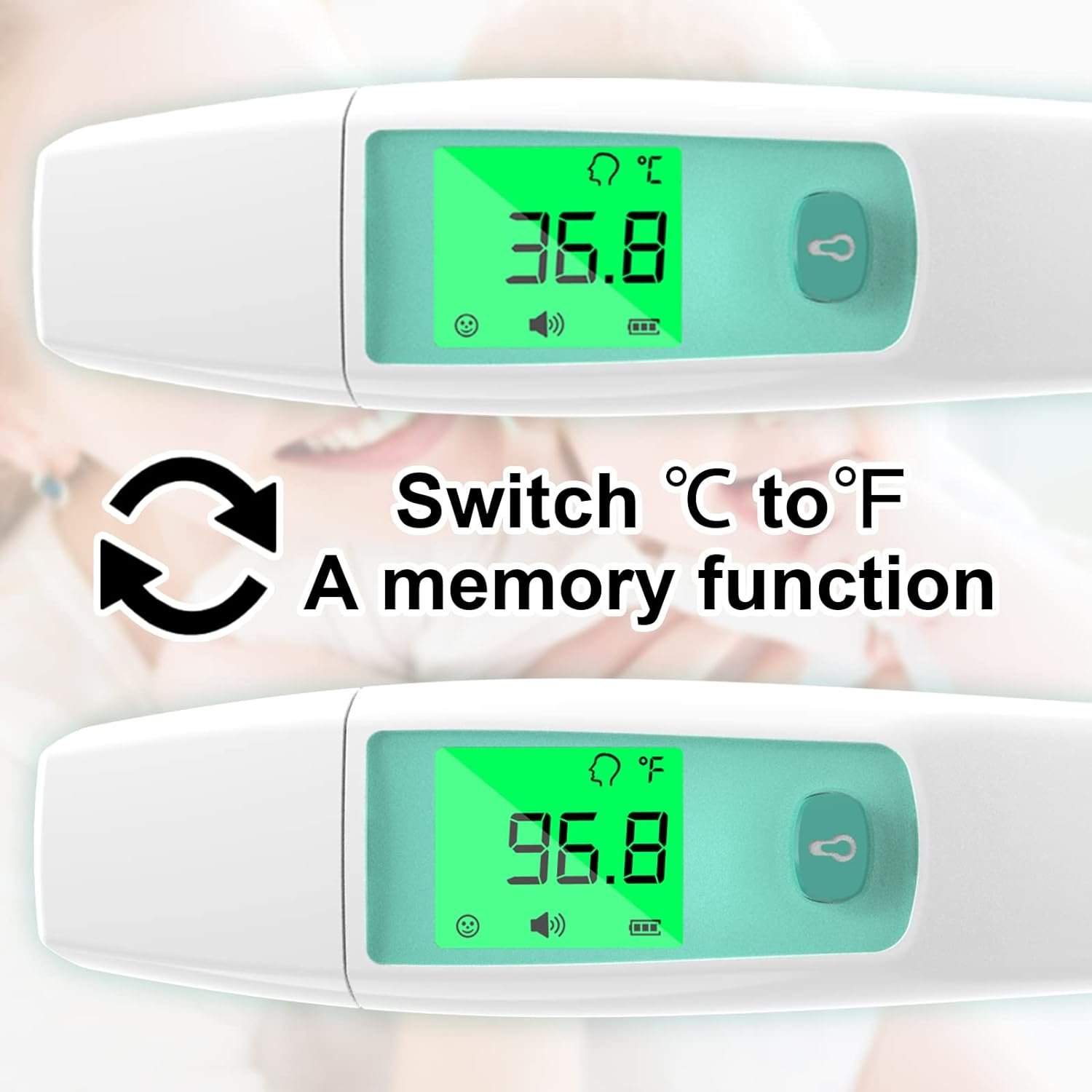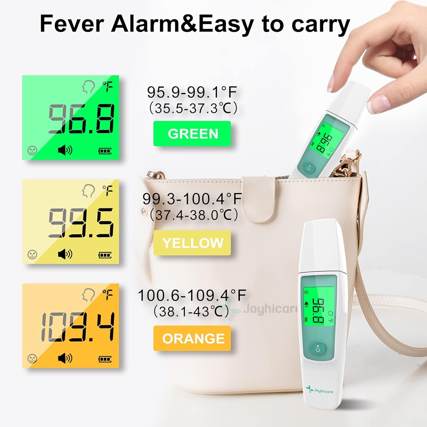 There are 3 different temperature level colors to help you identify: green 96.2°F -99.4°F (normal), yellow 99.5°F -101.3°F (low fever), orange 101.4°F- 109.4°F (high fever). The large backlit display is clearly visible even at night.+When the sensing electrode senses liquid, it will automatically trigger the flashing reminder of the “faucet” icon in the display, and block the current, completely solving the problem of bacterial infection caused by backflow