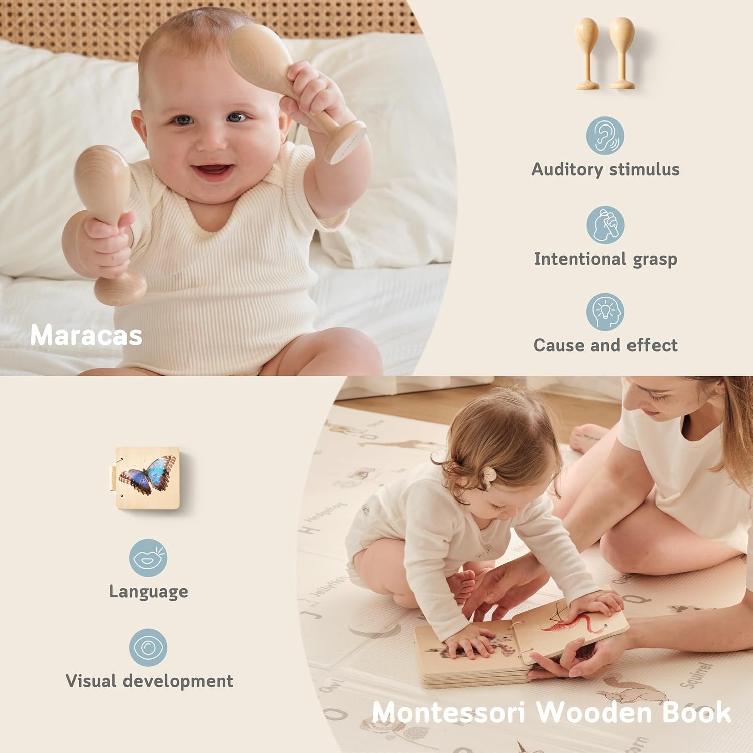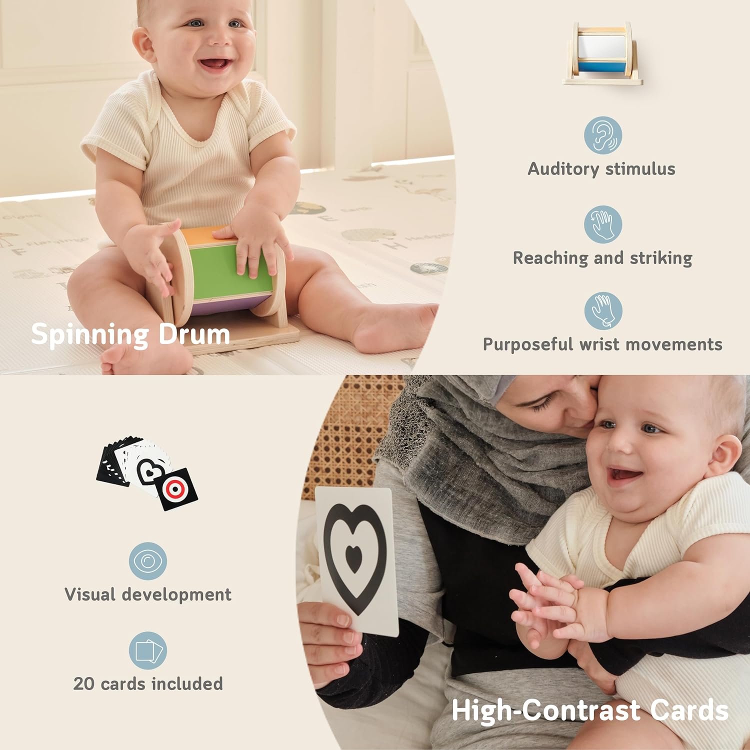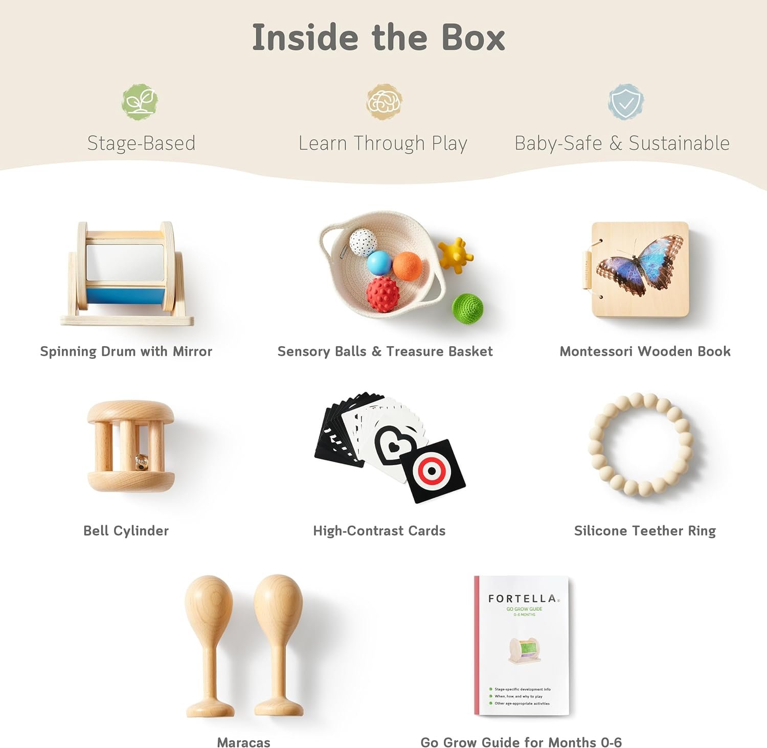 What’s Inside: Spinning rainbow drum with mirror, 20 high-contrast cards, bell cylinder, 6 sensory balls, treasure basket, silicone teether ring, a 10-page Montessori wooden book, a pair of maracas, and a 31-page parent guide.