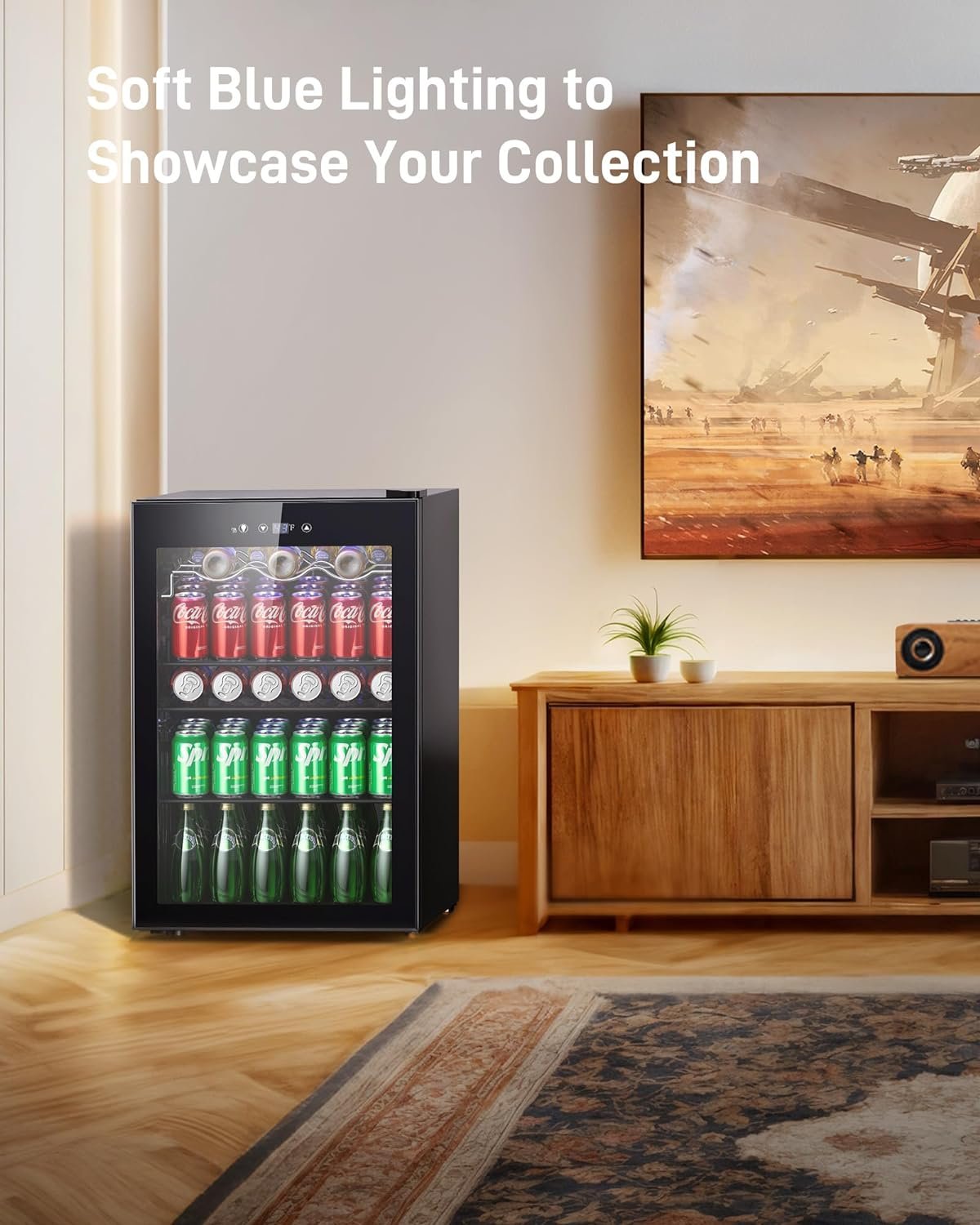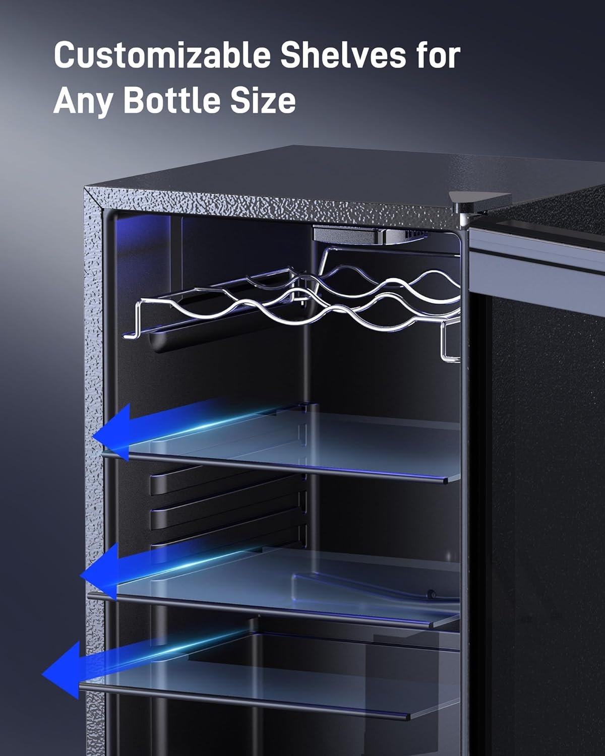 LED Lighting – Blue soft LED interior lighting not only showcases your beverages beautifully but also ensures no damage to the wine, freestanding drink refrigerator enhances ambiance in commercial displays or hotel rooms.