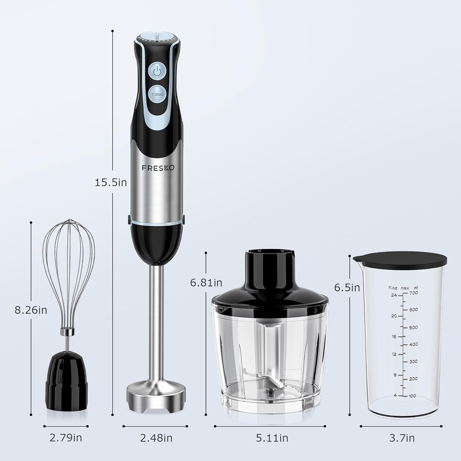 FRESKO Immersion Hand Blender 4-in-1, 500W Powerful Stainless Steel Emulsion Blender Handheld with 12-Speeds & Turbo Mode, Includes Measuring Cup, Chopper & Whisk, Ideal for Blending Soups & Smoothies