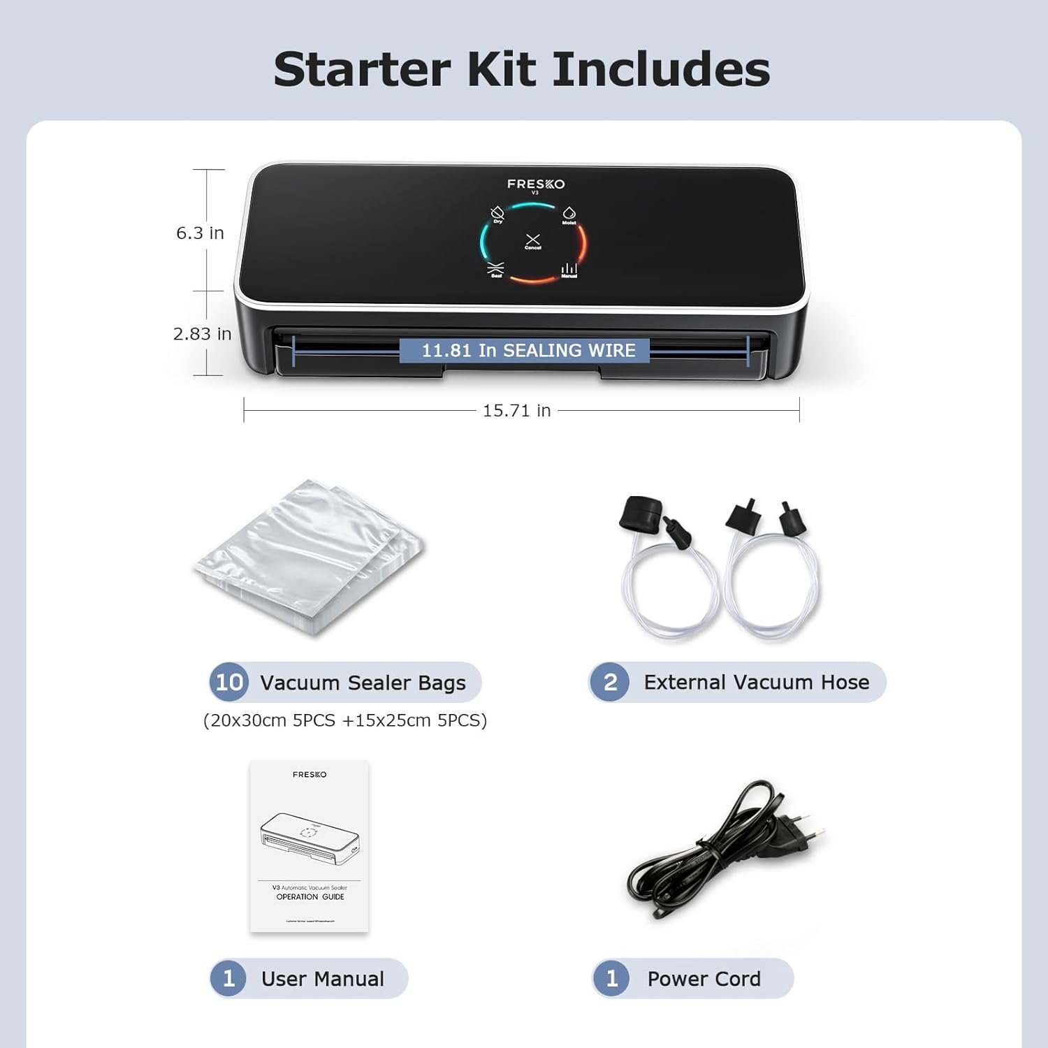 【What You Get】1 x Fresko vacuum sealer, 10 x vacuum bags, 2 x External hoses, 1 x power cord, 1 x user manual, 7 x 24 hours customer service. Please contact us freely when you have any questions about using the machine.