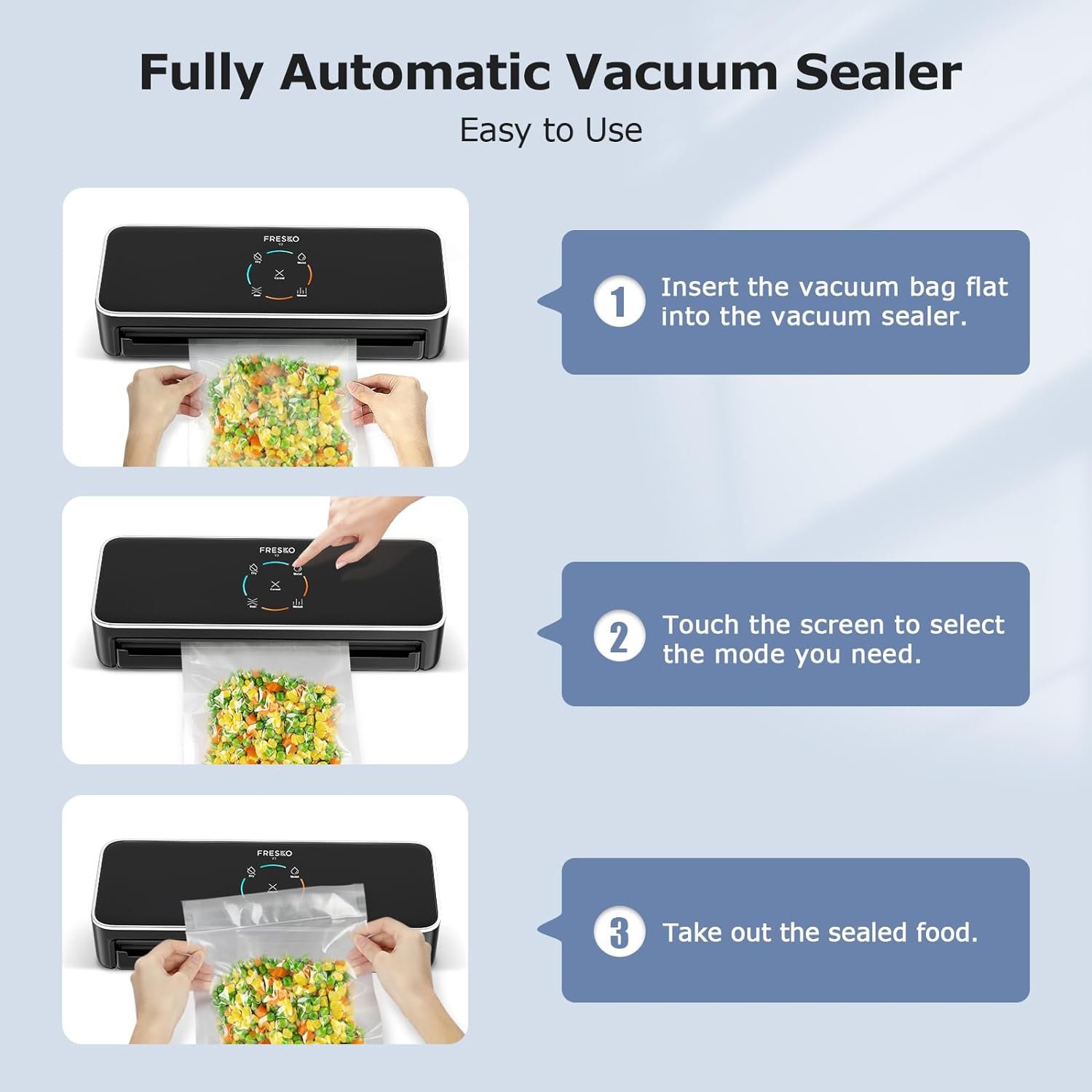 【Easy to Use】The fully automatic vacuum sealing machine for food without flipping and closing the lid simplify the process of vacuum sealing, just insert the bag properly and choose the mode you need, it will do the rest. The visual progress bar conveniently let you know the working status timely.
