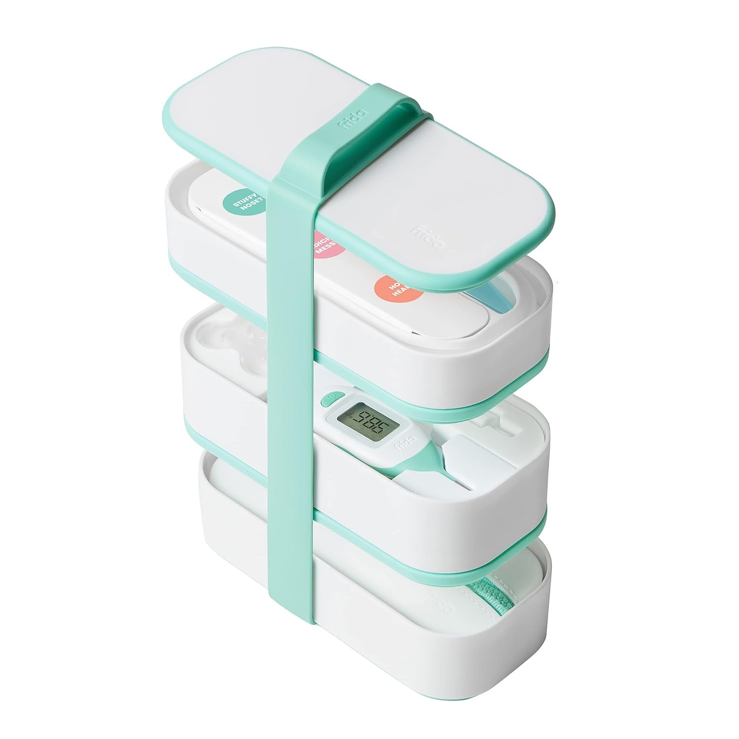 We bento-ver backwards to create a Frida storage system that plays nicely in your drawers and in the diaper bag. Meet the Mobile Medicine Cabinet. Separate its layers in your nursery drawers to keep fuss-busting essentials easily accessible. When you’re ready to take baby out on the town, pack it, stack it and strap it to keep everything together while on-the-go. We loaded it up with NoseFrida + Filters, MediFrida, Rectal Thermometer + a removable pouch so you’re prepped for baby’s snotty, under-the-weather moments no matter where they happen. Plus, the removable silicone pouch is perfect for storing baby meds or must-haves.