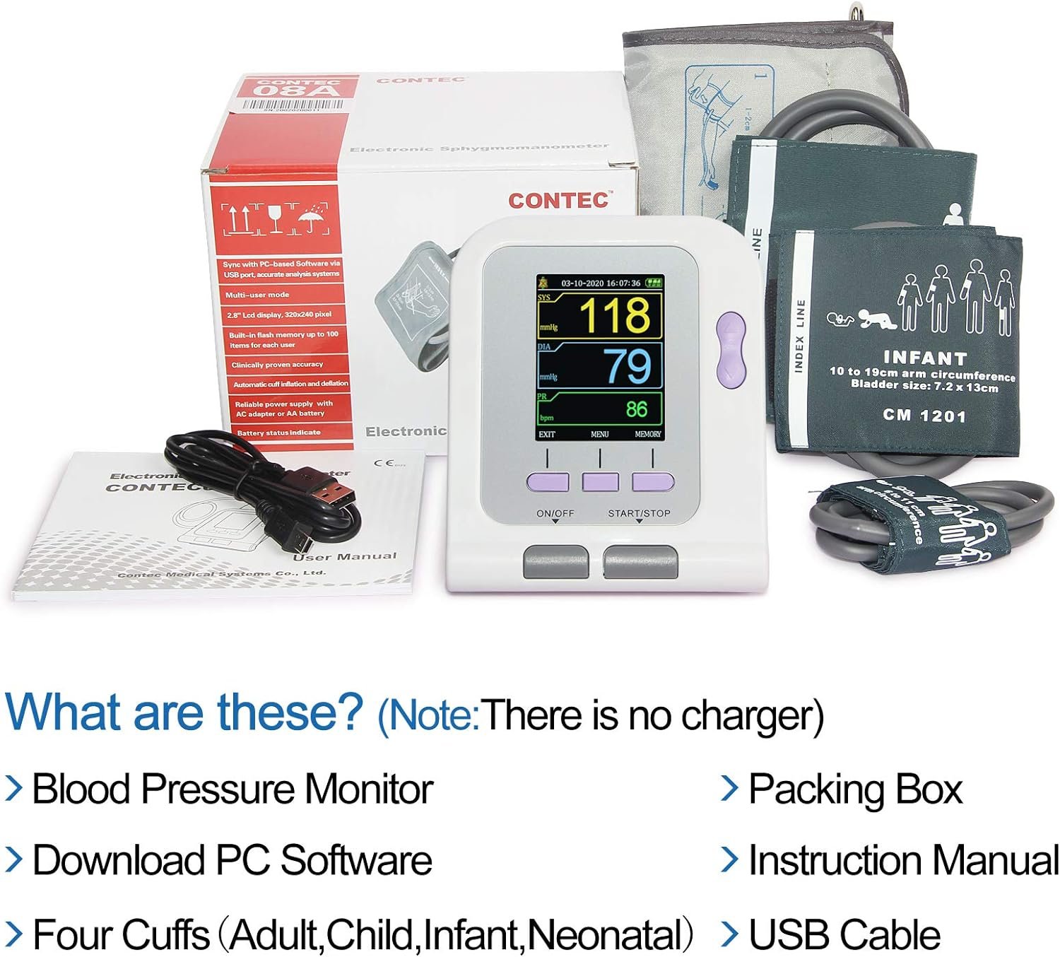 Contents in the package:One main unit CONTEC08A monitor,USB cable,download PC software,Four cuffs(Adult,pediatric,infant,neonatal),user manual