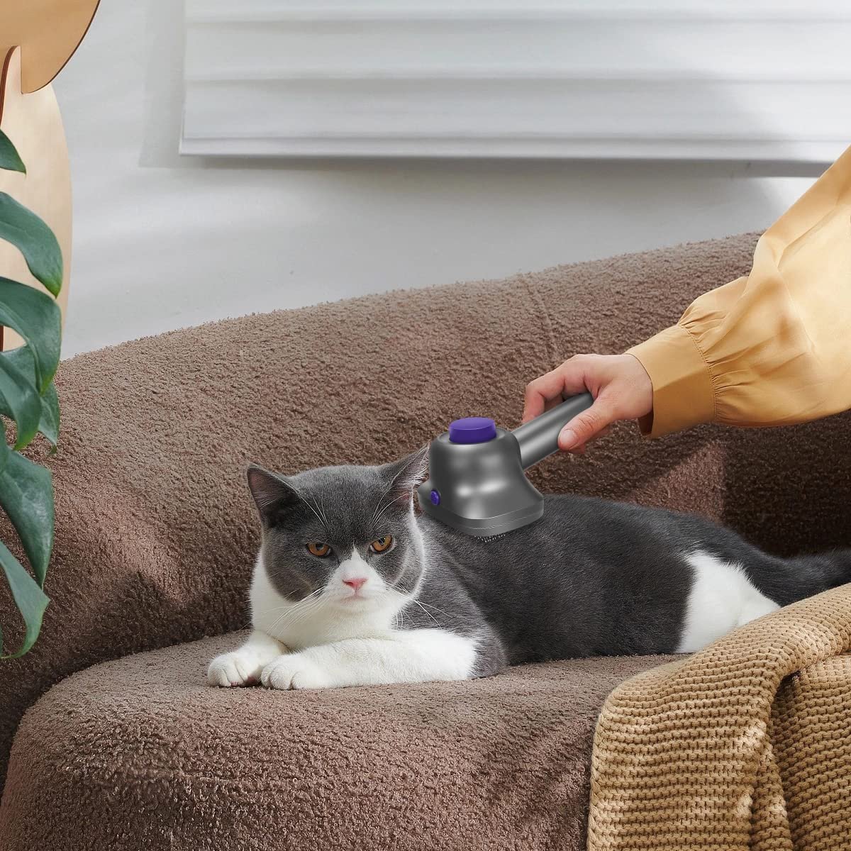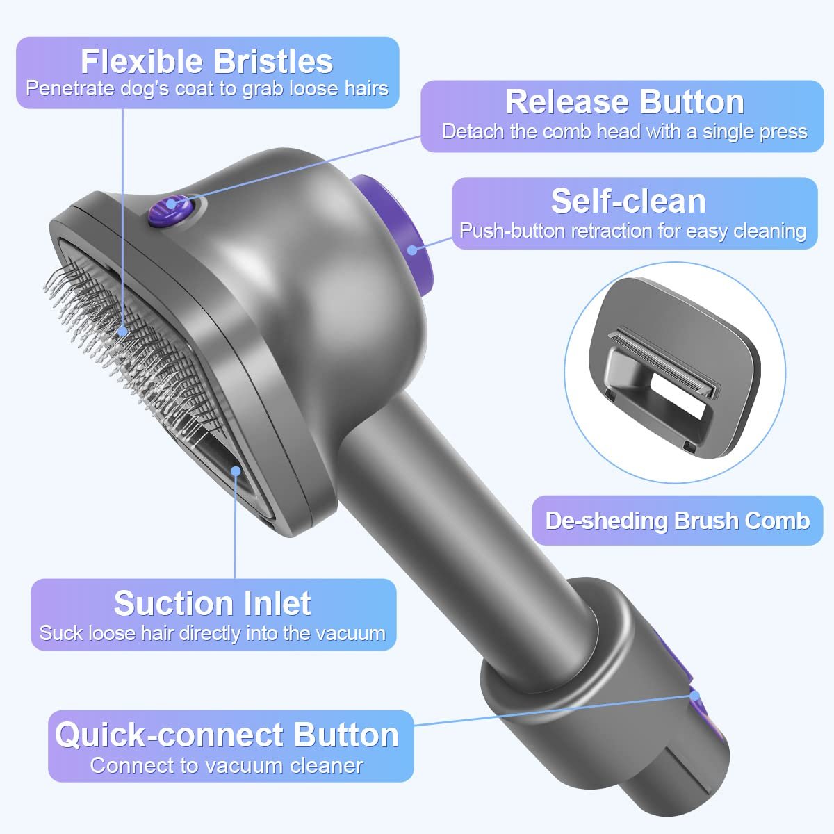 Two interchangeable combs for grooming and de-SheddingConnects to Dyson vacuum cleaner – no flying hair around
