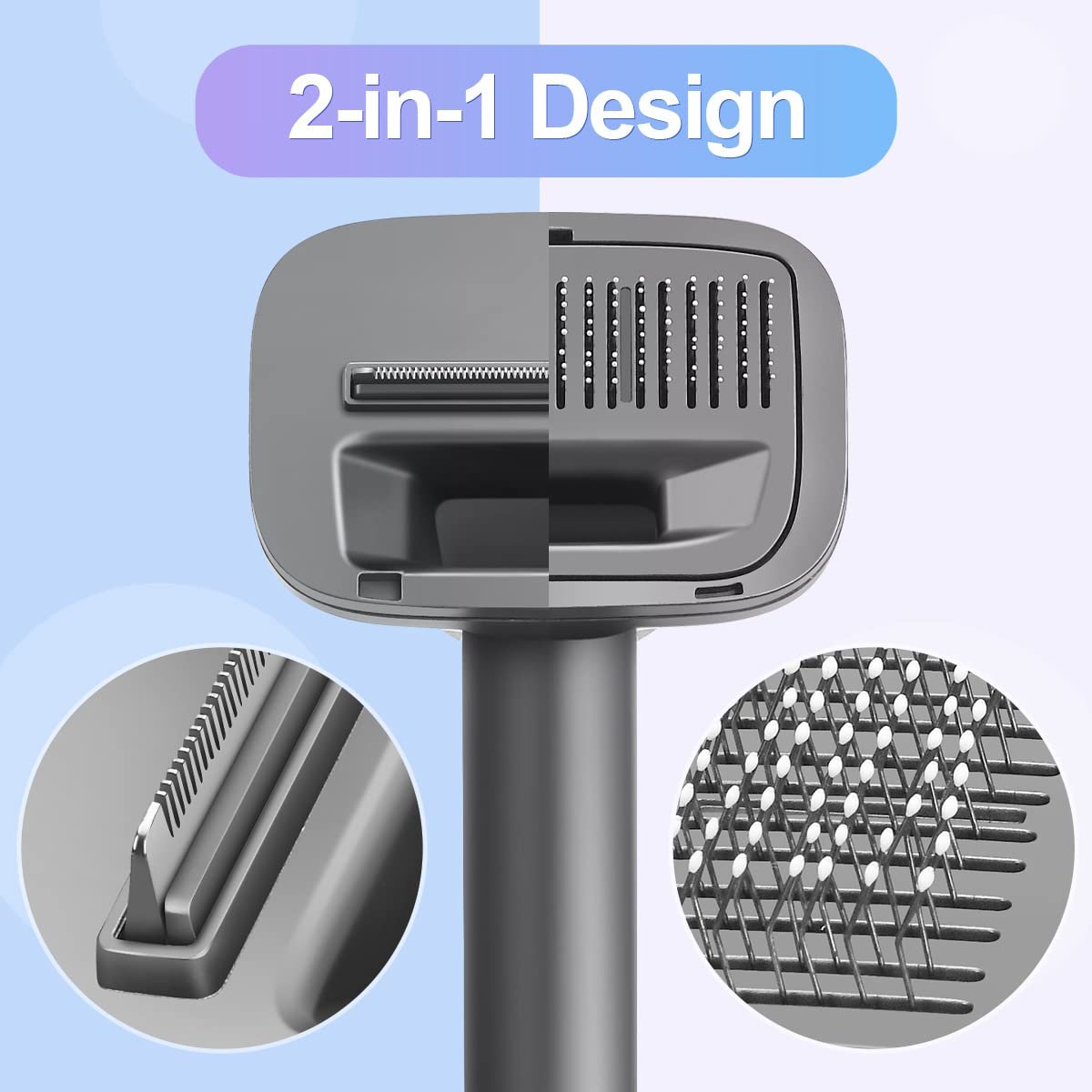 2-in-1 Design –With its innovative 2-in-1 design, this pet brush tool features interchangeable grooming and de-shedding brush heads that can be switched out in a snap with just a gentle push, making it effortless to customize your pet’s grooming experience according to their needs.