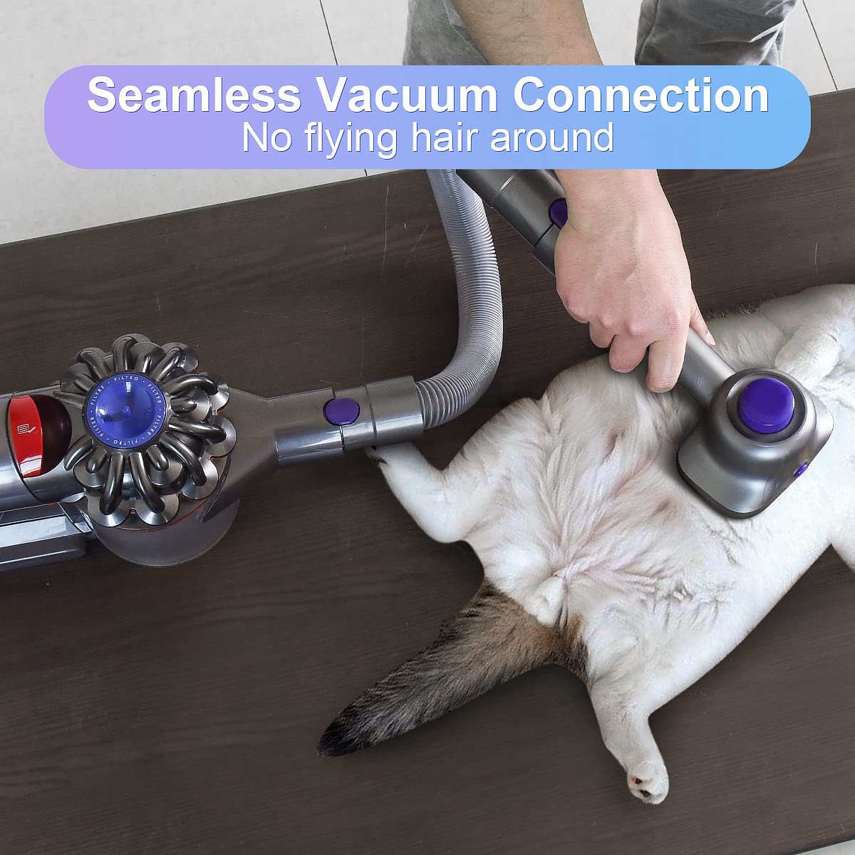 The 2 in 1 pet grooming tool self-cleaning brush gently removes mats, tangles and loose hair, dirt, and debris for a healthier, shinier coat. One of the key features of our grooming tool is its ability to connect directly to Dyson vacuum cleaners, such as the V7, V8, V10, V11, V12, and V15 models. This means that you no longer have to worry about loose pet hair getting all over your home during grooming.