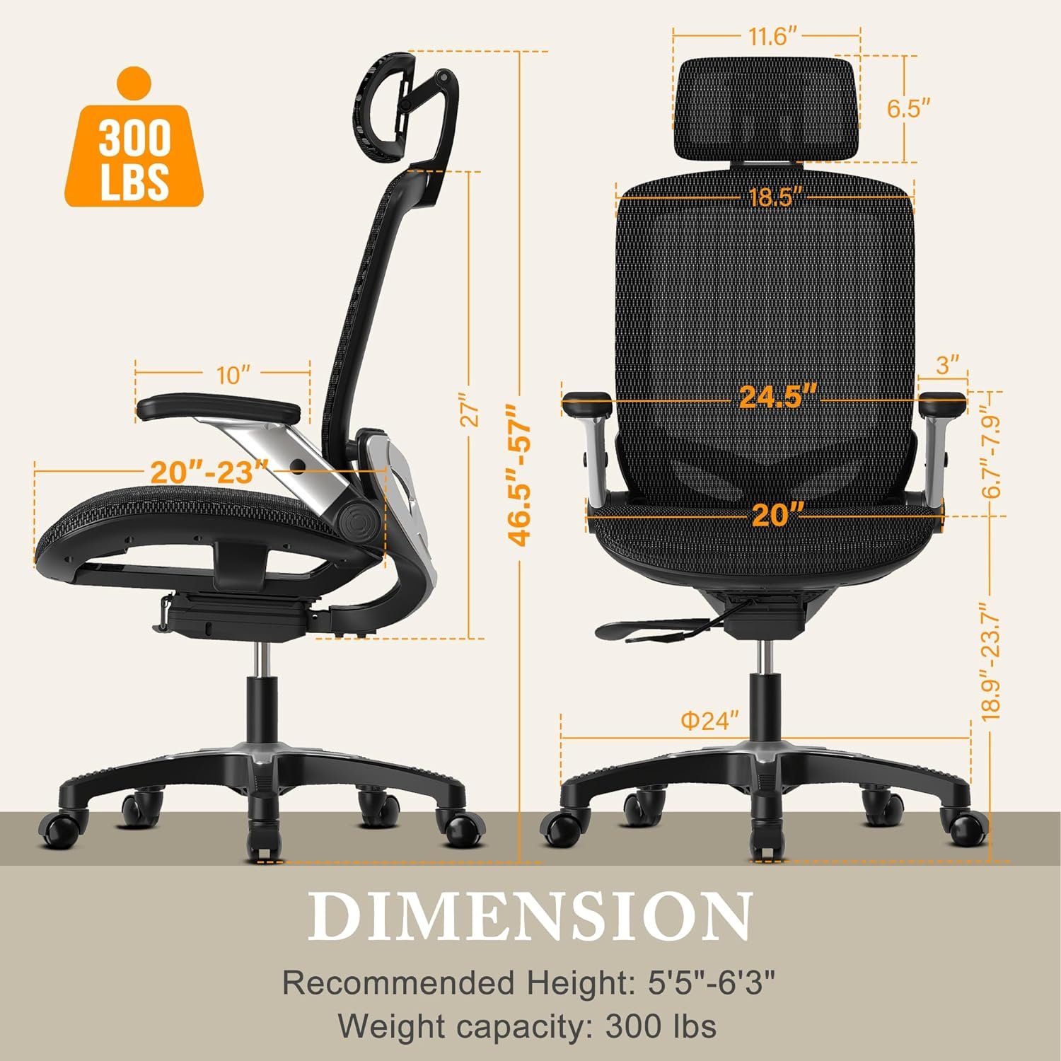 【LARGE CHAIR SIZE】- The upgraded office chair has a larger mesh seat and mesh back, which can be easily adjusted to suit your body and preferences. Overall dimenion: 25.2″L x 25″W x 44.5″-52.5″H. Seat Dimensions: 18.5″L x 20″W x 18.5″-23.5″H. Weight capacity: up to 300lbs. It fits people of 5’9” tall and below.