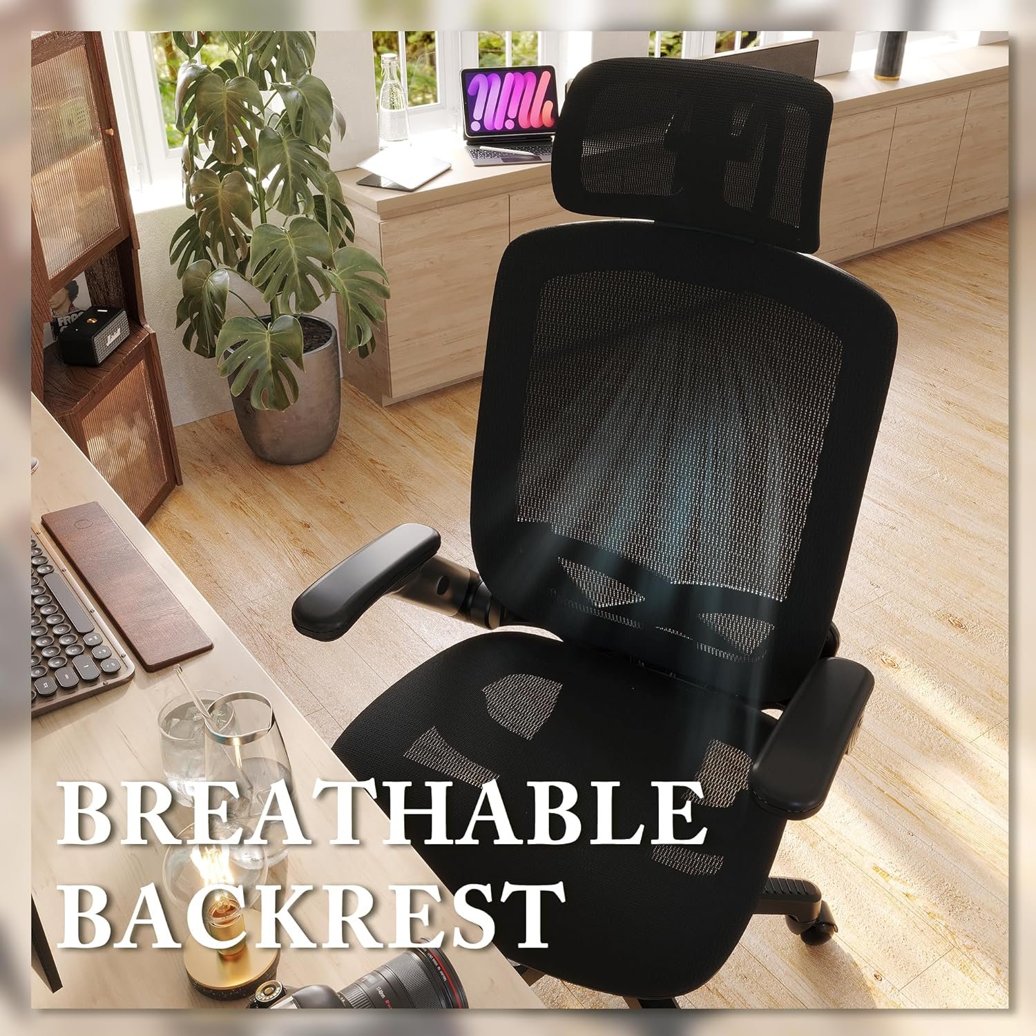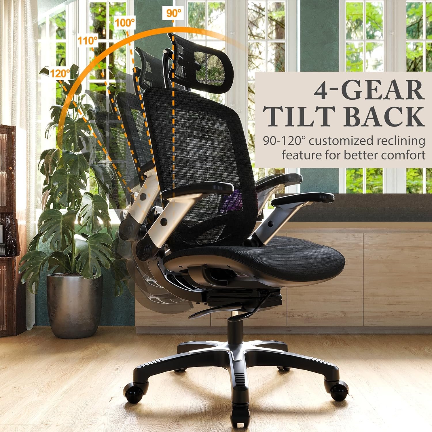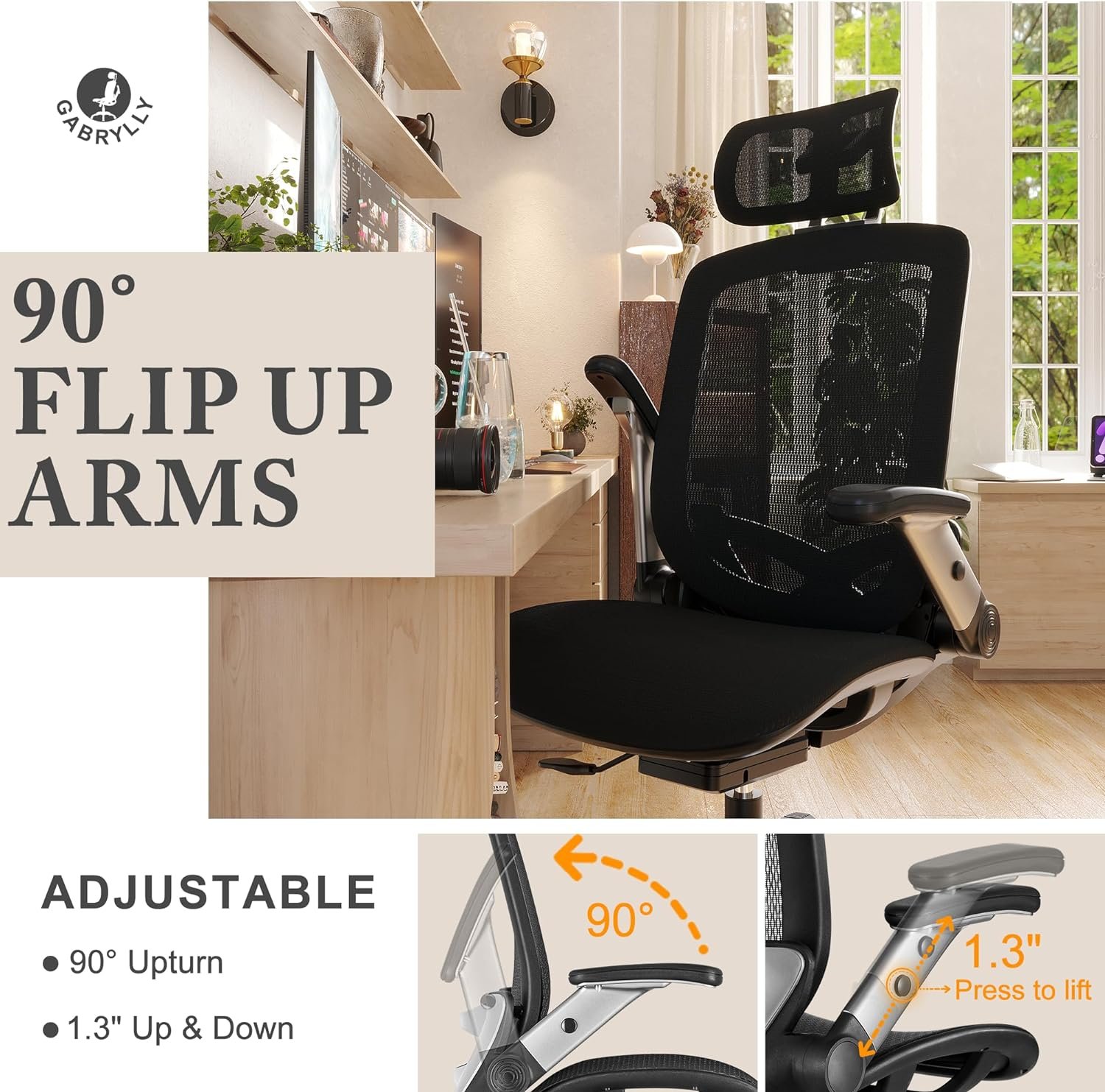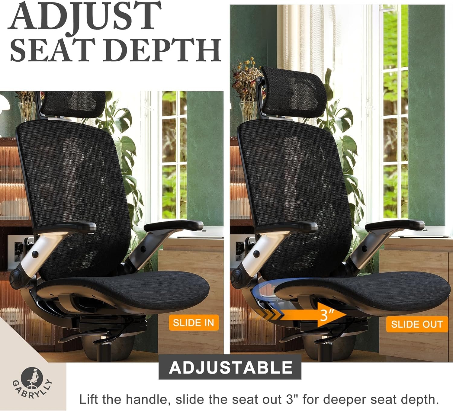 GABRYLLY Ergonomic Office Mesh Chair, High-Back Desk Chair with Sliding Seat, Adjustable Flip-up Armrest & 2D Headrest, 4-Gear Tilt Function, Swivel Computer Gaming Chair for Man Woman