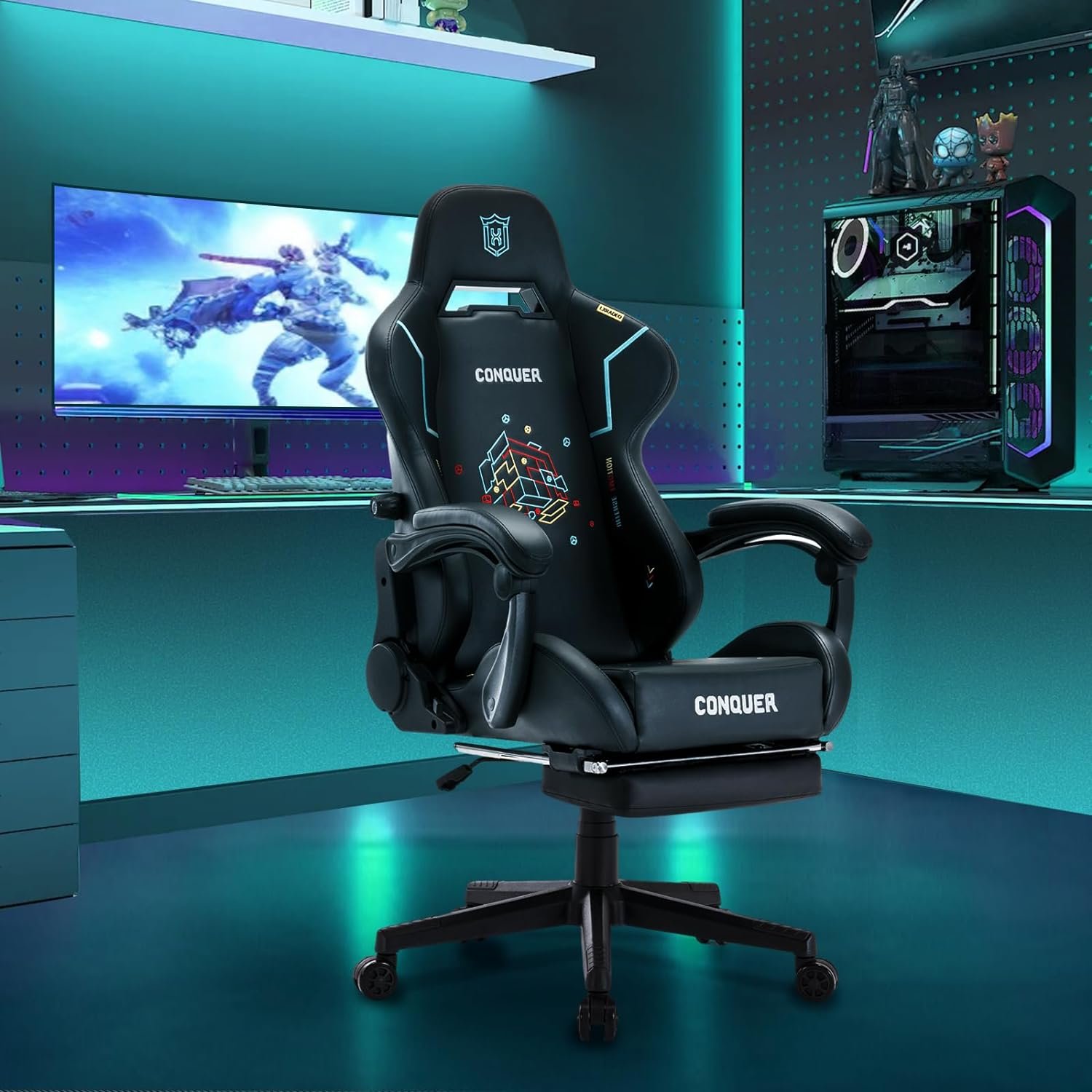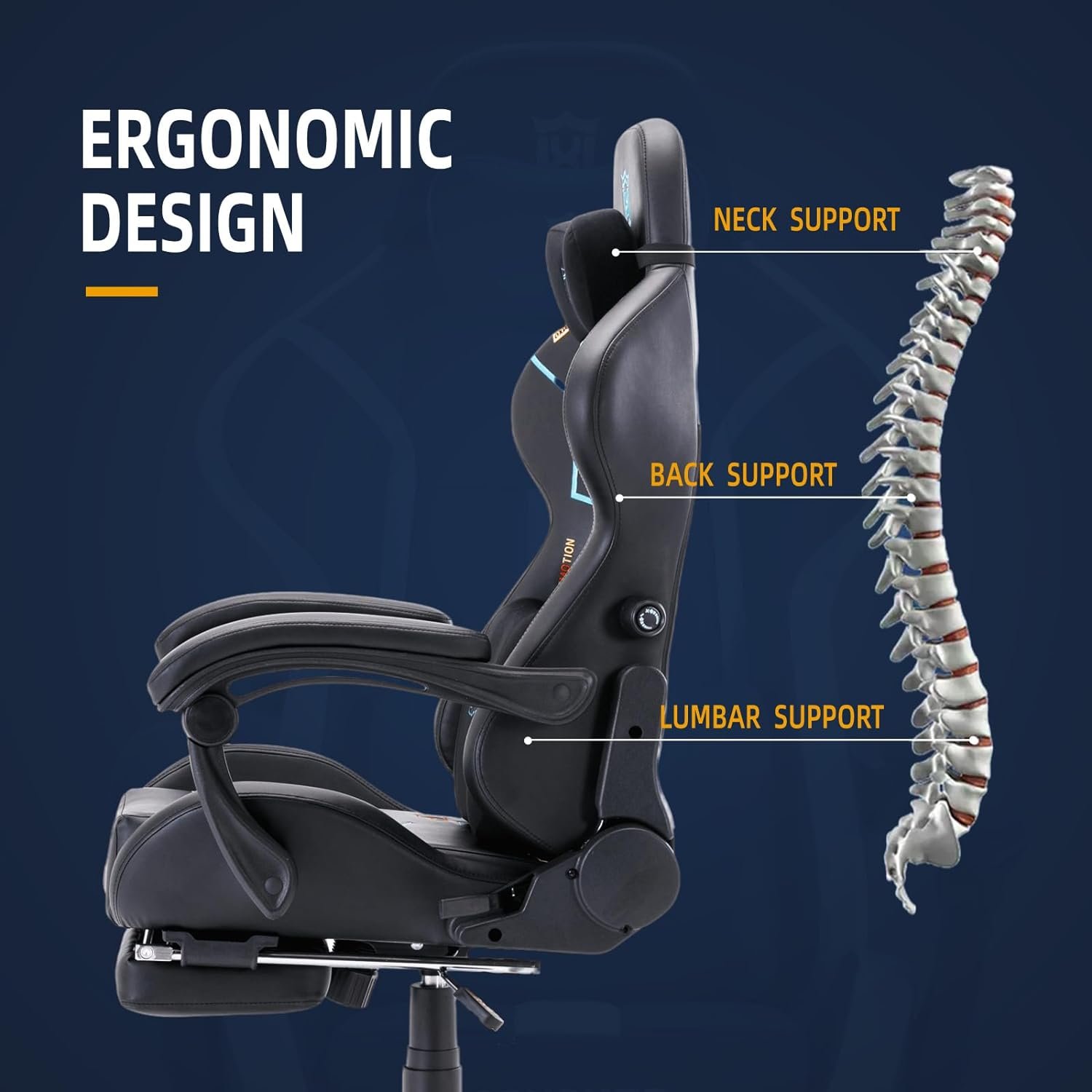 Ergonomic Gaming Chair with VVIP Comfort:Experience the ultimate in ergonomic gaming comfort with our CON gaming chair. The backrest is equipped with a built-in racing seat, featuring a lumbar support system that focuses on the L1 to L5 segments of the spine. Adjust it forwards or backwards using the knob to enhance comfort and alleviate the discomfort associated with prolonged sitting, ensuring you remain relaxed throughout your gaming sessions.