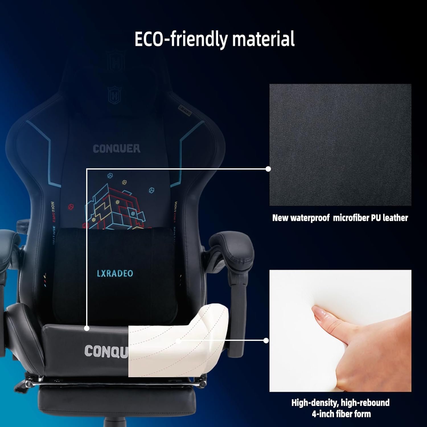 New Eco-friendly Material:Our gaming chair is crafted using cutting-edge waterborne microfiber PU leather, which not only enhances breathability and abrasion resistance but also reduces its environmental impact. The high-density, high-rebound 4-inch fiber sponge provides the same level of elasticity and comfort as a sofa, and thanks to the premium materials used, any chemical odors have been completely eliminated.