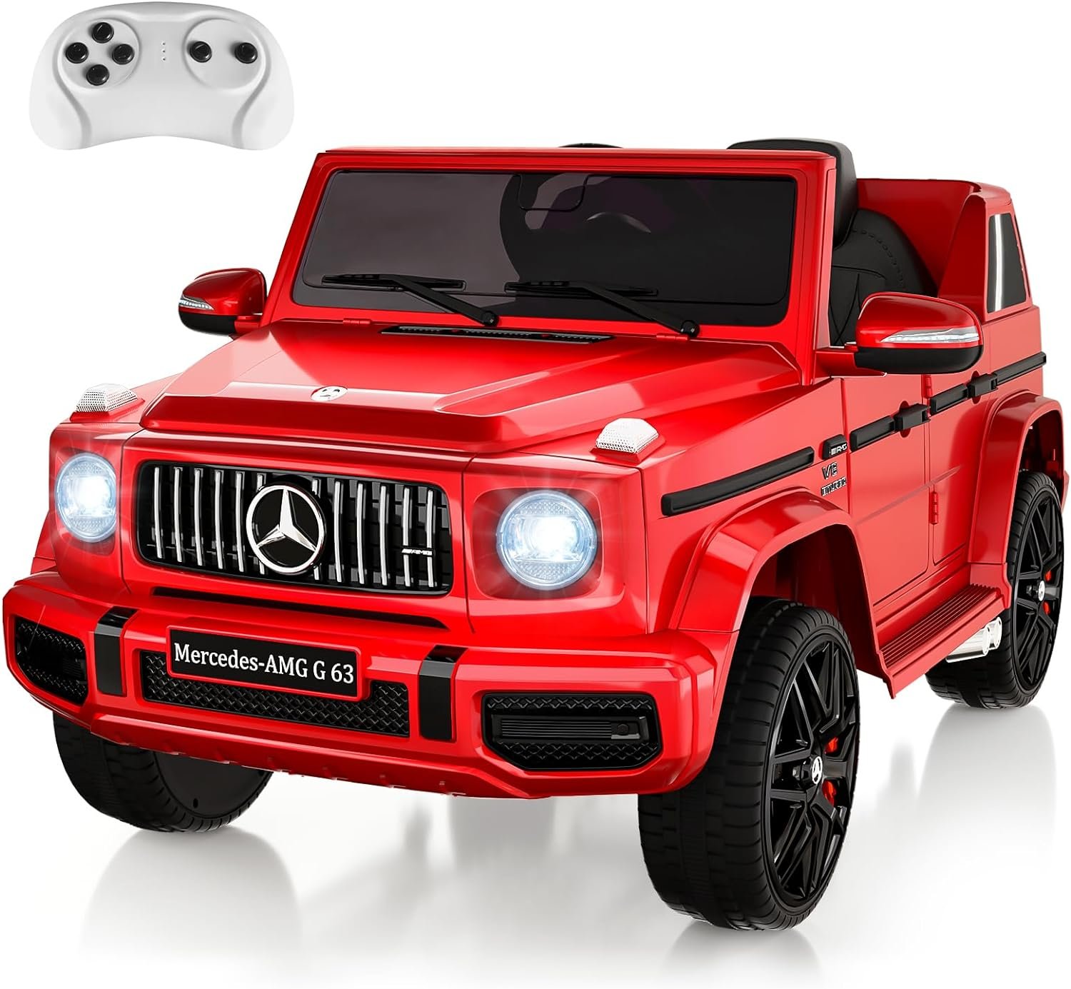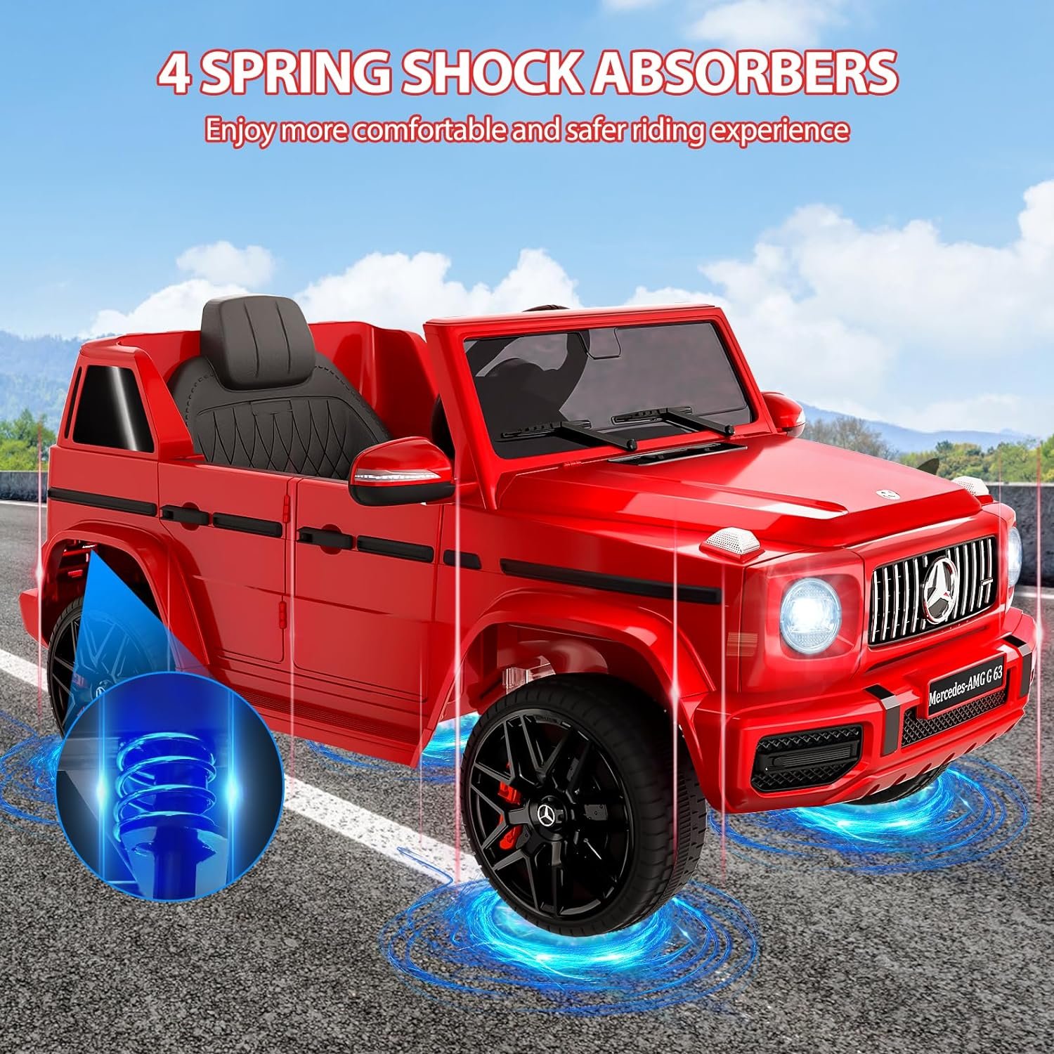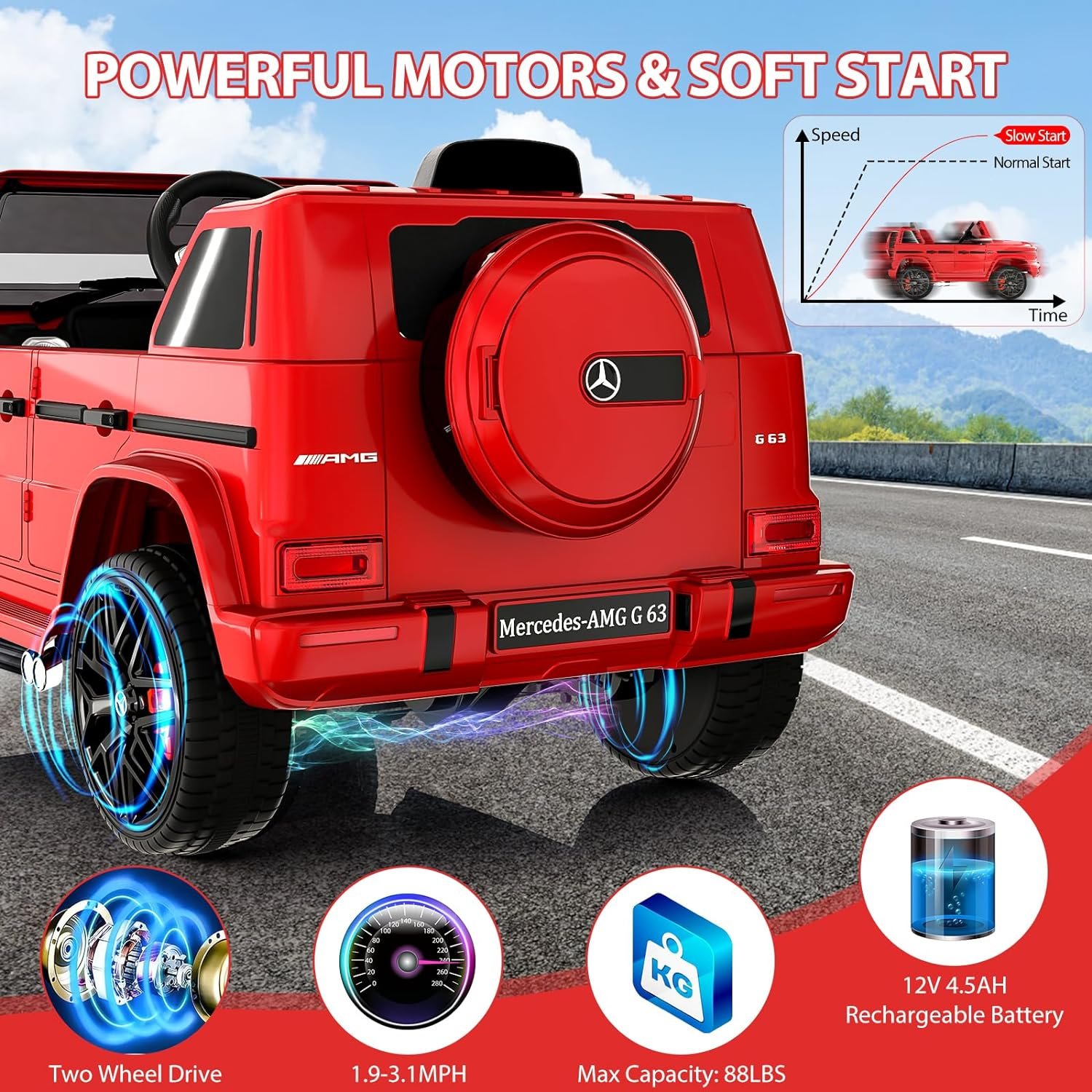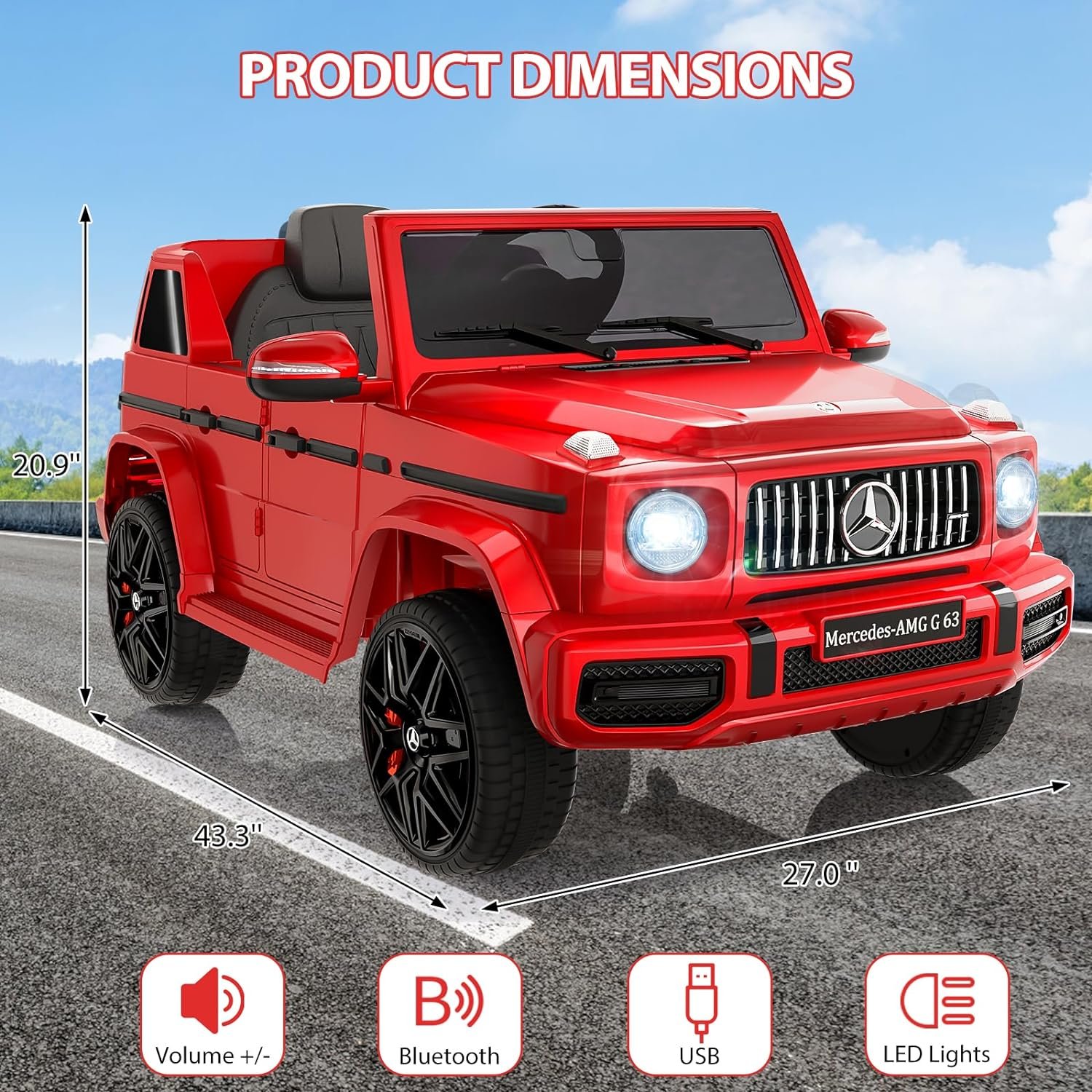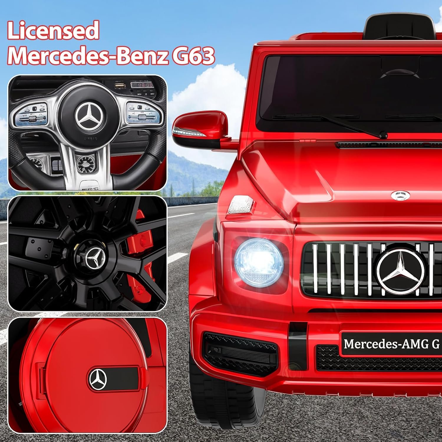 【Multiple Attractive Function】Licensed from Mercedes Benz G63, the kids’ electric vehicles comes with bright LED headlights, a rear spare tire, realistic dashboard, and built-in music player that provides children with an immersive and realistic driving experience at speeds ranging from 1.9-3.1 mph.