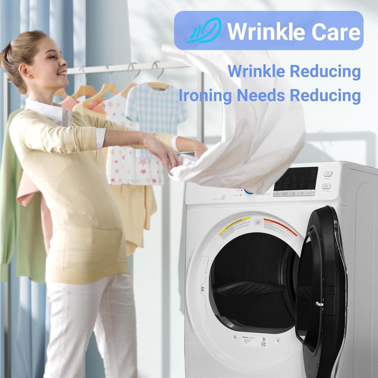 【Convenient Design Clothes Dryer Machine–Steam & Wrinkle Care】: The steam function of laundry dryer helps relax fabric fibers, reducing wrinkles and making it easier to iron, thus reducing ironing time and effort. The wrinkle care function of clothing dryer reduces the need for high-temperature ironing, which can extend the life of clothing by avoiding damage to fabric fibers.