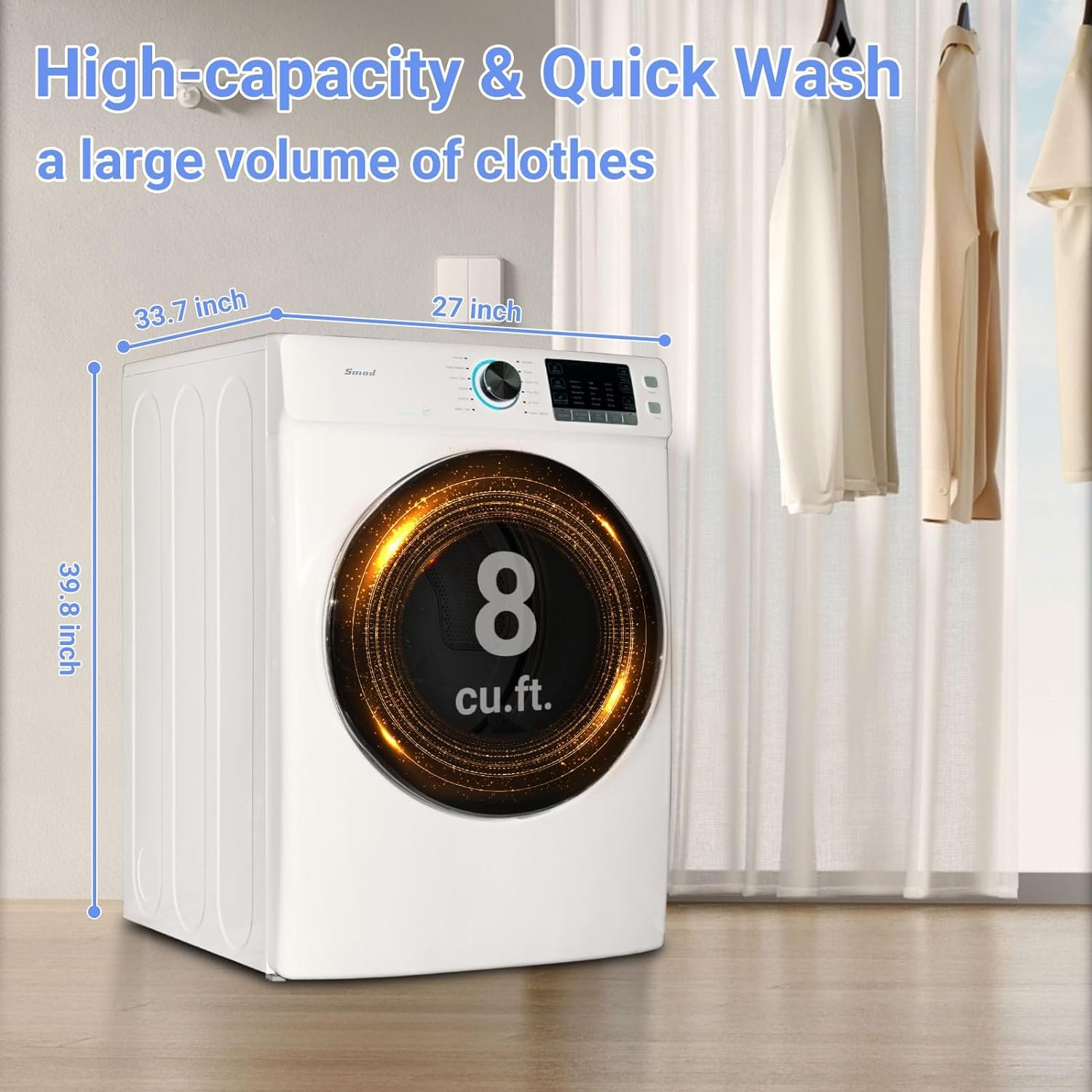 【Gas Dryer Machine–High Performance】 : The clothes dryer with 8 cu.ft large capacity for large families or situations requiring the handling of a large volume of clothes. Gas dryer machine can evenly dry 3/4 full load of laundry in only 30 min with Quick Dry Cycles.