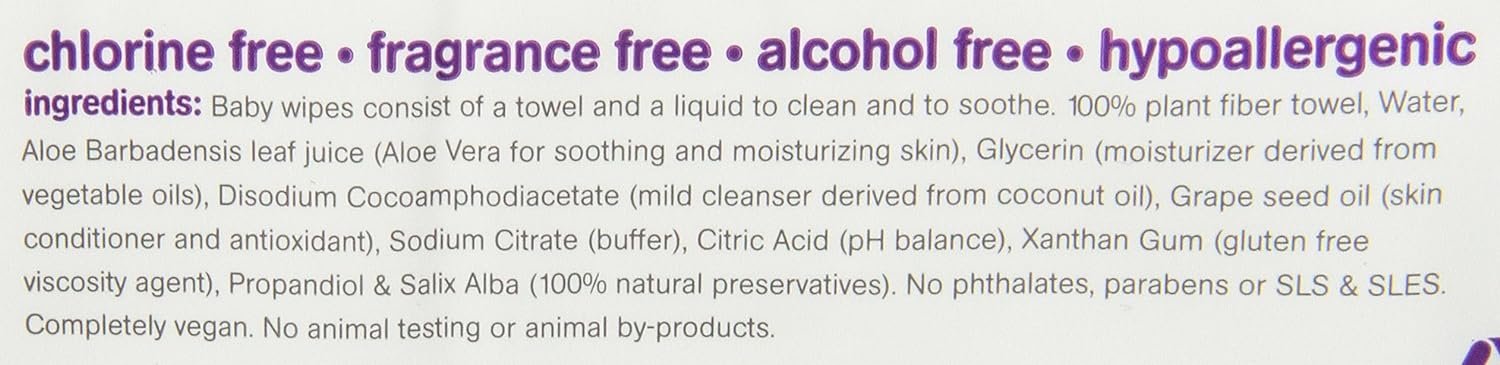Baby wipes consist of a towel and a liquid to clean and to soothe. 100% plant fiber towel, Water, Aloe Barbadensis leaf juice (Aloe Vera for soothing and moisturizing skin), Glycerin (moisturizer derived from vegetable oils), Disodium Cocoamphodiacetate (mild cleanser derived from coconut oil), Grape seed oil (skin conditioner and antioxidant), Sodium Citrate (buffer), Citric Acid (pH balance), Xanthan Gum (gluten free viscosity agent), Iscaguard Propandiol & Salix Alba (100% natural preservative). No phthalates, parabens or SLS & SLES. Completely vegan. No animal testing or animal by-products.