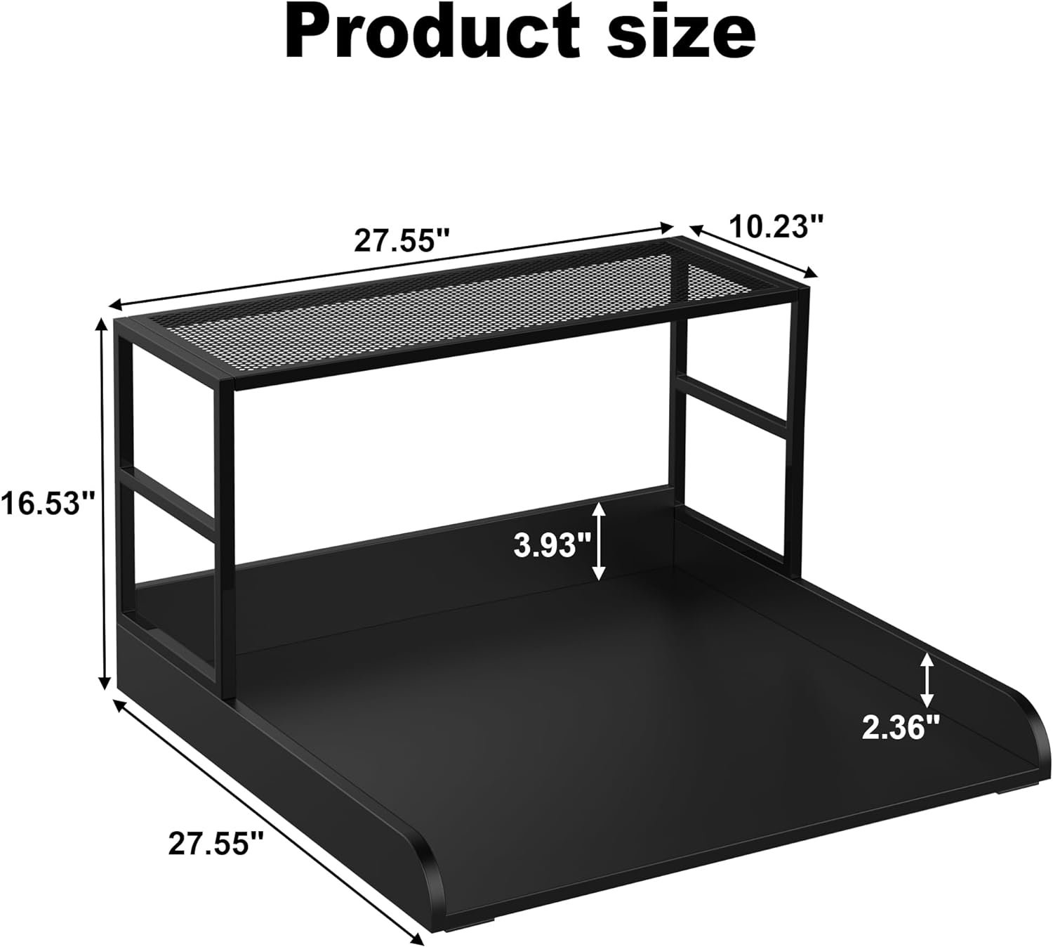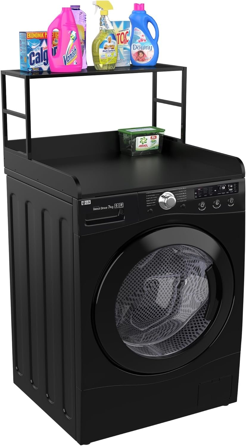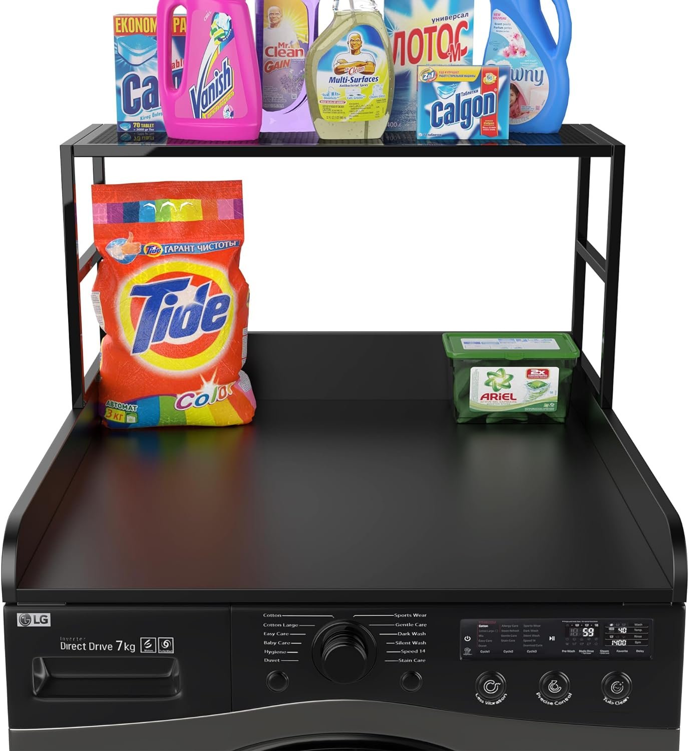 Spacious countertop: Our washer dryer countertop offers a broad surface, efficiently utilizing the top space of your washing machine and dryer. You can effortlessly fold clothes,sort laundry,or simply place clothing necessities such as detergents on the surface. The sleek black design seamlessly integrates into any color of your machines,also with your home decor, adding an elegant touch without compromising space.