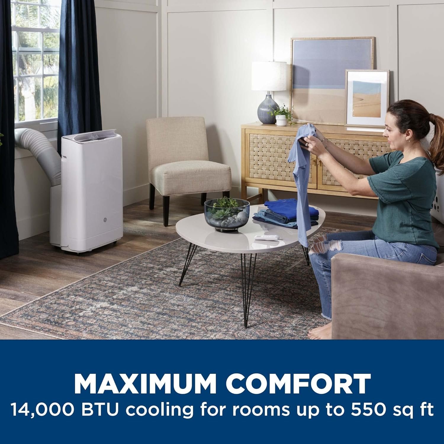 GE 14,000 BTU PORTABLE AIR CONDITIONER is designed to efficiently cool and heat medium rooms up to 550 sq ft; easy window installation kit with no cutting required included so you can start cooling right away; 11,000 BTU Heat, 9,950 BTU SACC.Filter Type : Easy Access Permanent Mesh