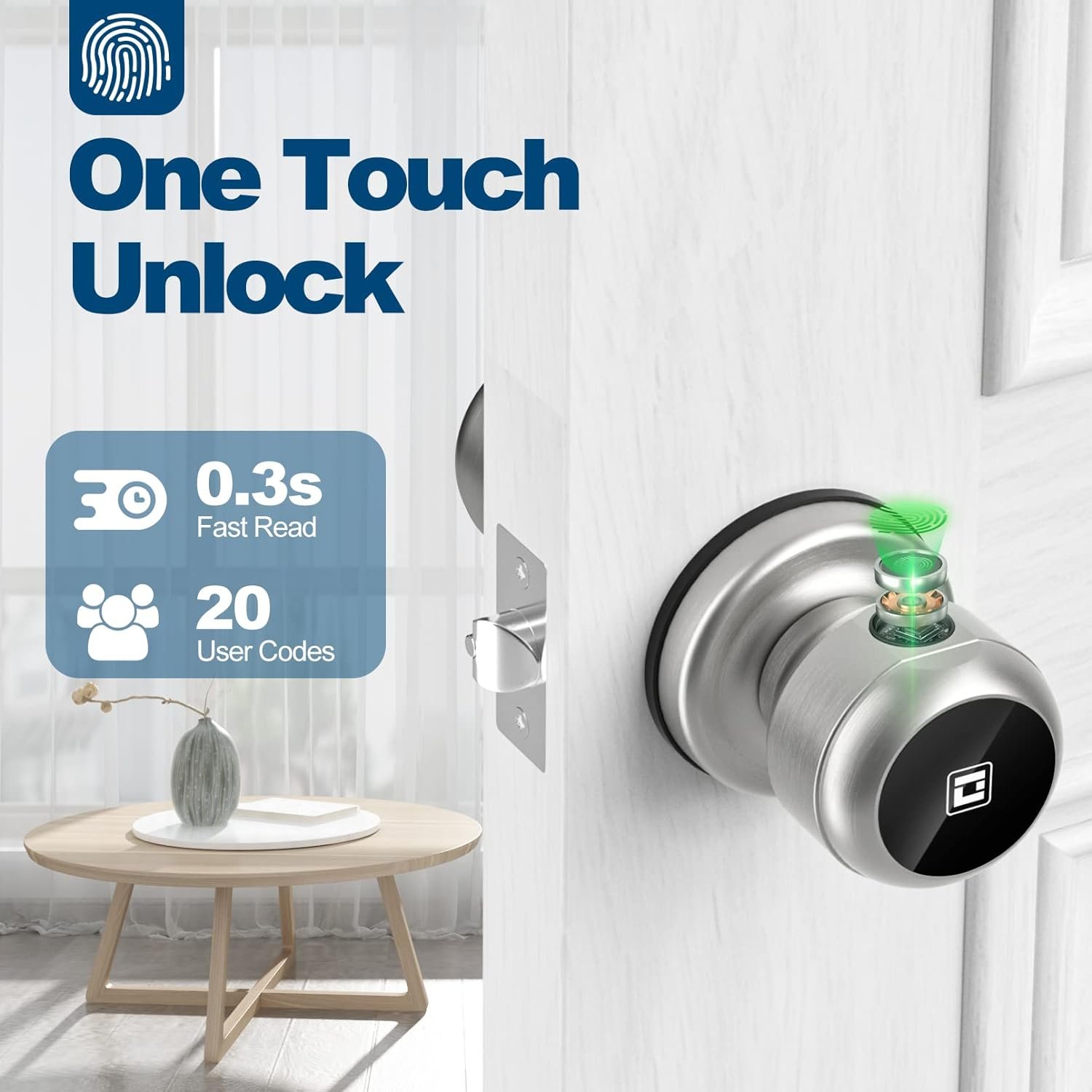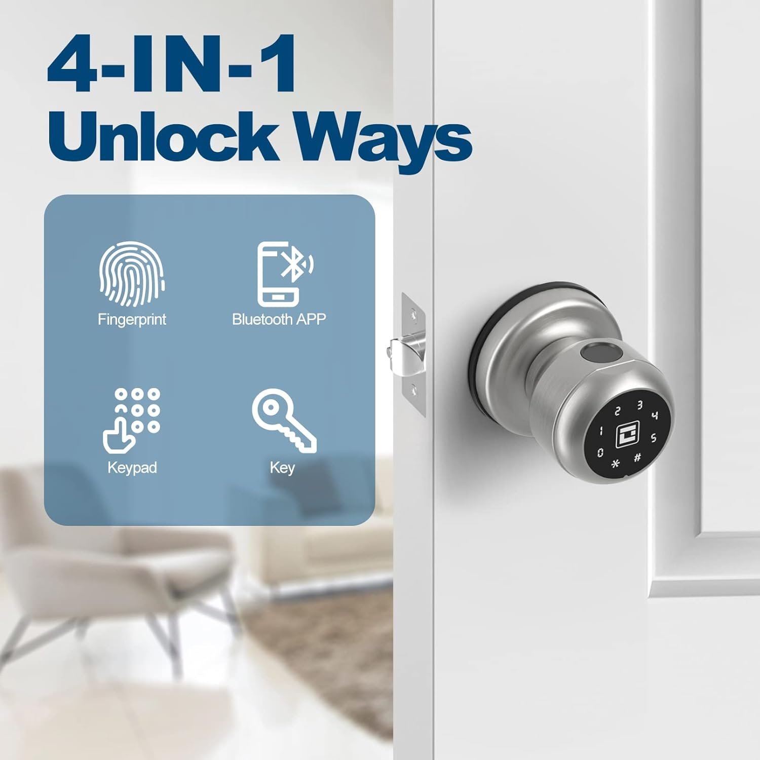 4-IN-1 Unlock Ways: Smart door knob with keypad, Including fingerprint, password, App, and key, multiples unlock ways. update to this fingerprint door knob, no more worry about forget taking keys and the problem of losing keys.