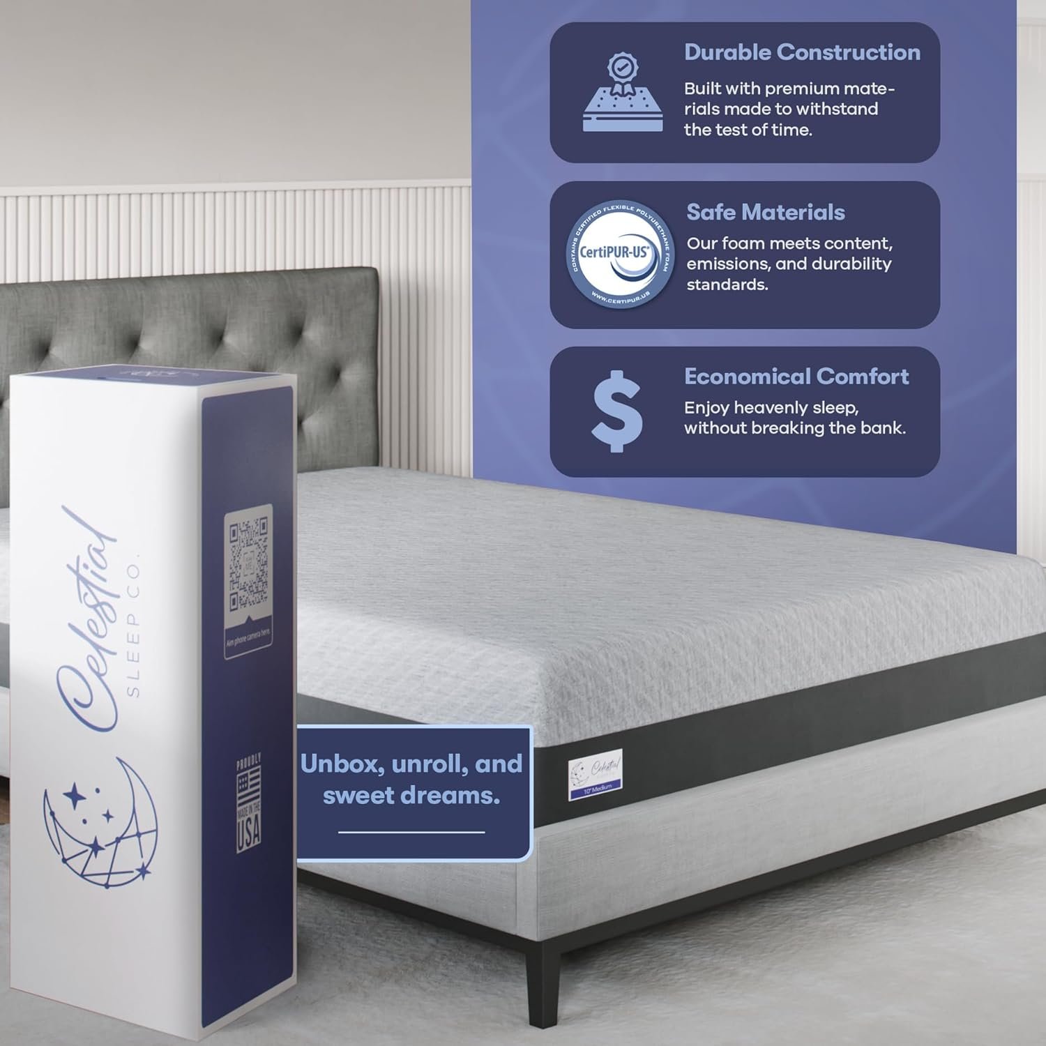CertiPUR-US Certified: At Celestial Sleep, we care about your health and the environment. That’s why our mattresses are made with CertiPUR-US certified materials. Rest easy knowing that you’re sleeping on a clean and comfortable bed.