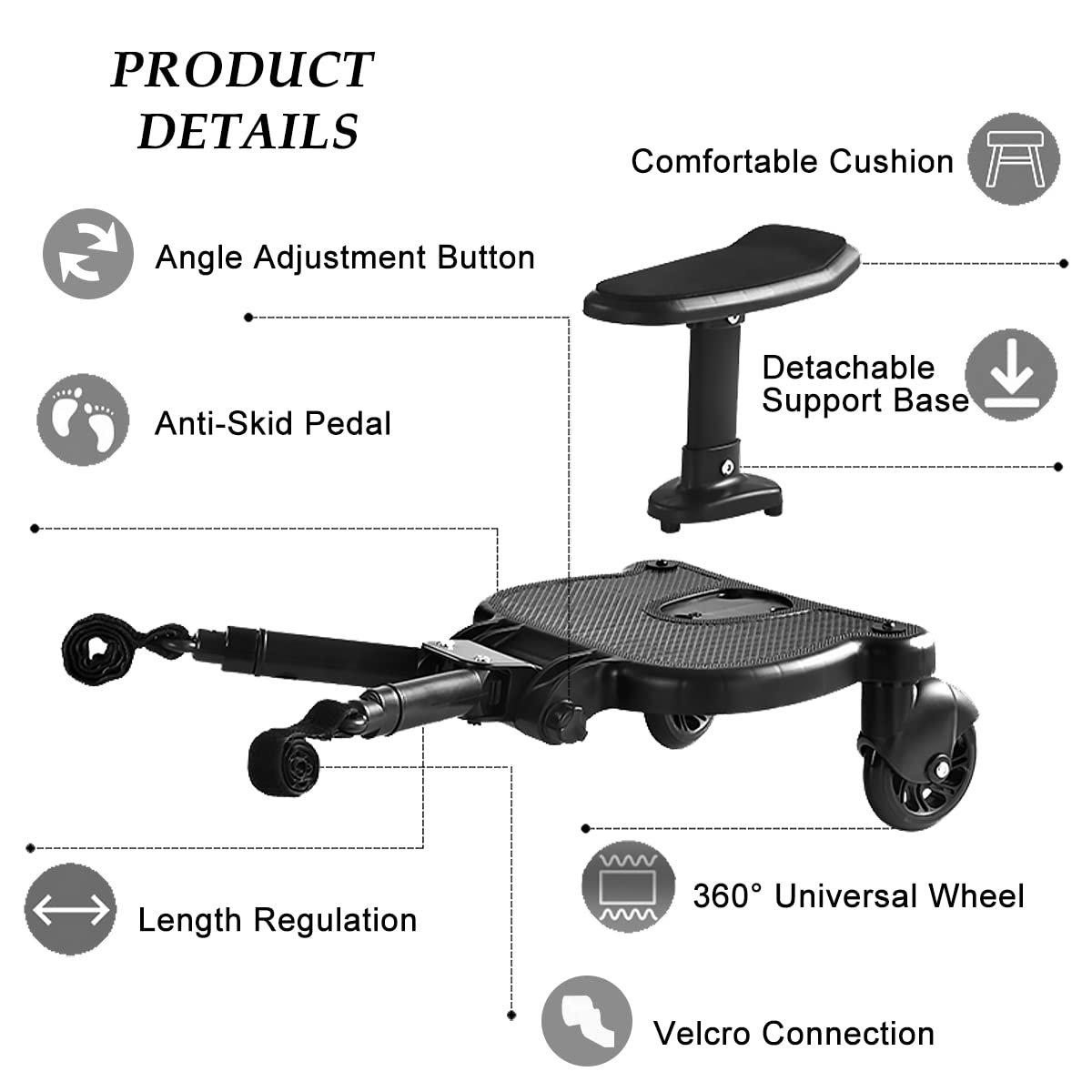 ✅【Robust Reliability】: The pedal has a non-slip design;The seat has durable soft cushions.Strong, sturdy and expertly designed, our state-of-the-art stroller ride-on board safely holds children up to 60lbs! They accommodate young children as they grow, and since each features a smooth wheel, everyone enjoys a comfortable ride.