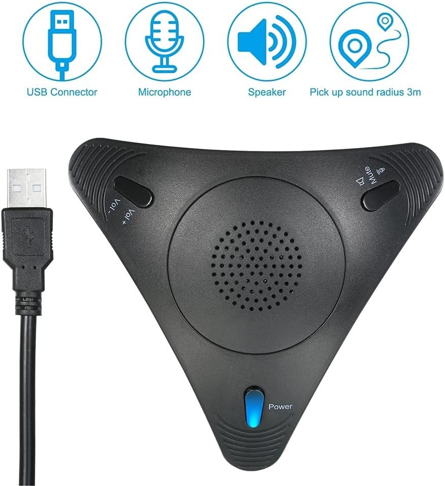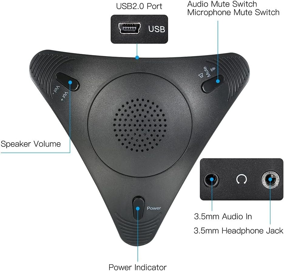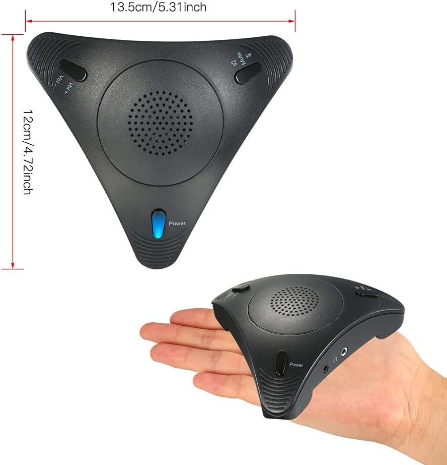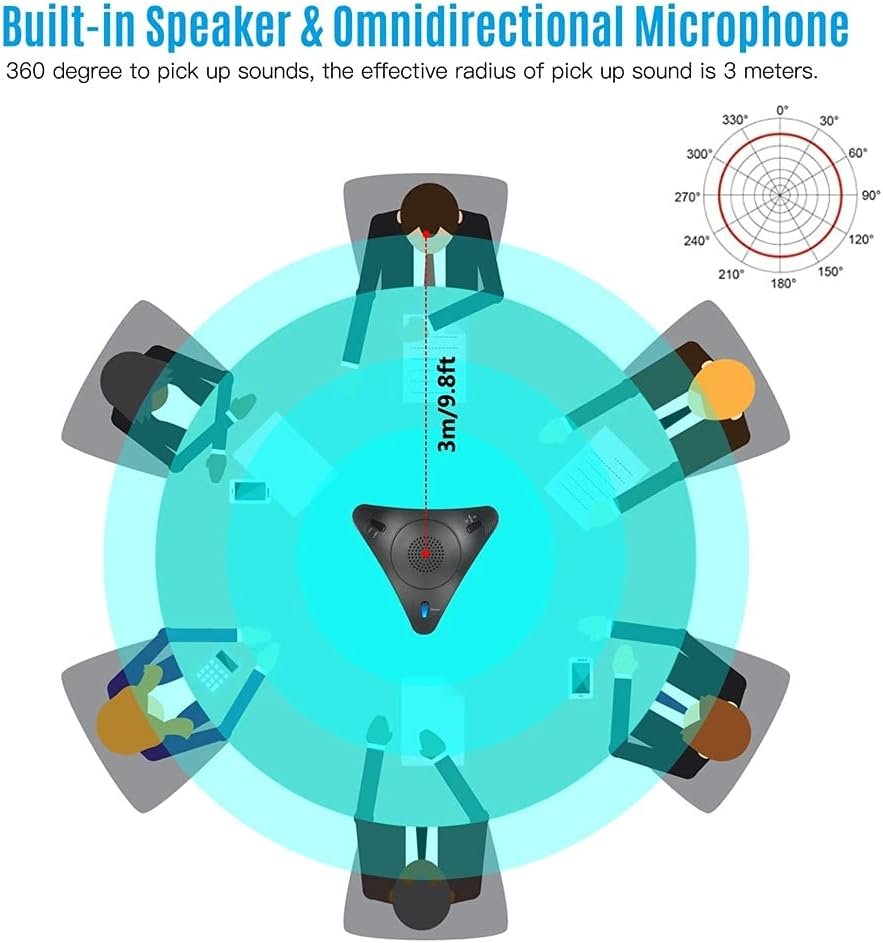 Built-in speaker, and high sensitivity omnidirectional microphone, suitable for meeting rooms of 20-30 square meters, 360 degree to pick up sounds, the effective radius of pick up sound is 3 meters.