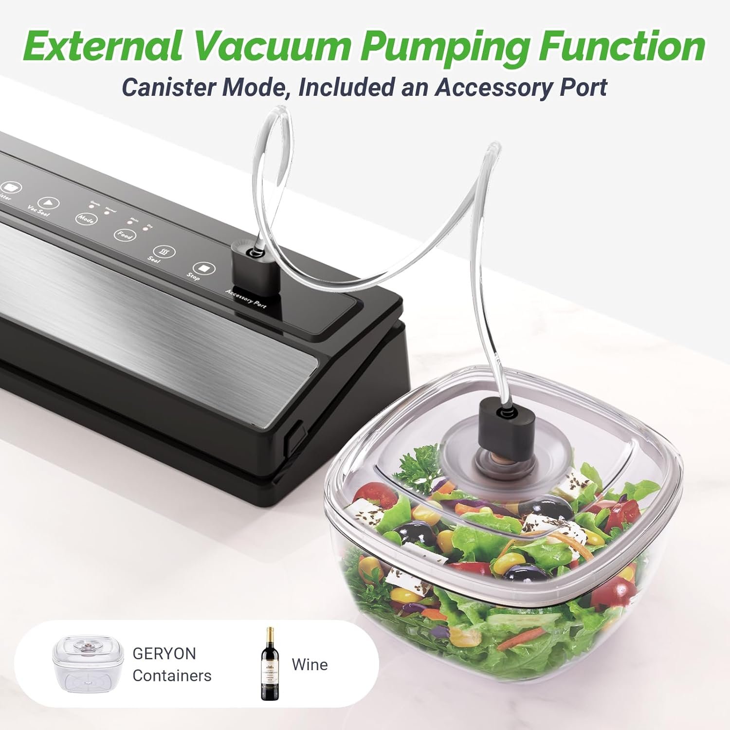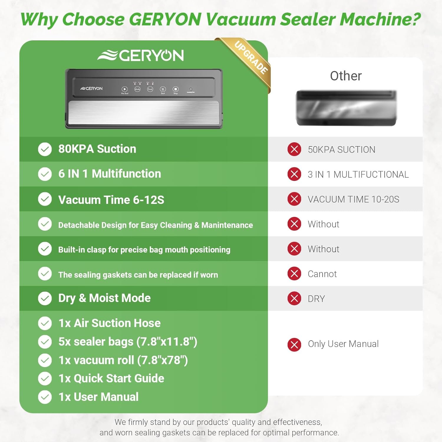 Two Sealing Modes: Geryon vacuum food sealer is designed with two selectable modes to provide your food with best possible preservation based on your different types of food. You can also reseal bags of rolls, snacks that you only want to seal