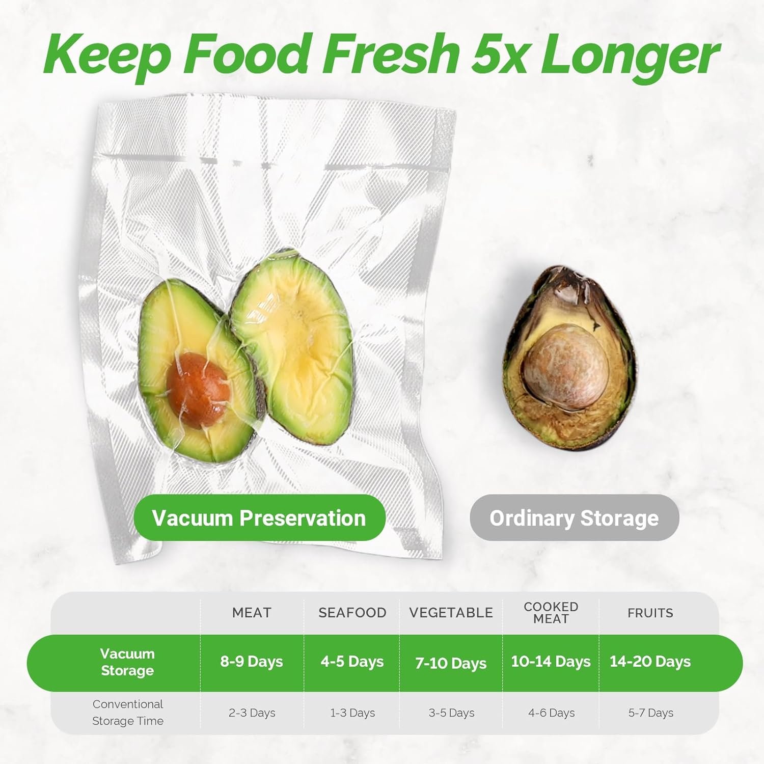 Fully Starter Kits: 1x Air suction hose,5 x Heat-seal bags (7.8″*11.8″),1 x roll (7.8″*78″),1xUser Manual, 1 x Vacuum Sealer; Manufacturer’s Lifetime Support