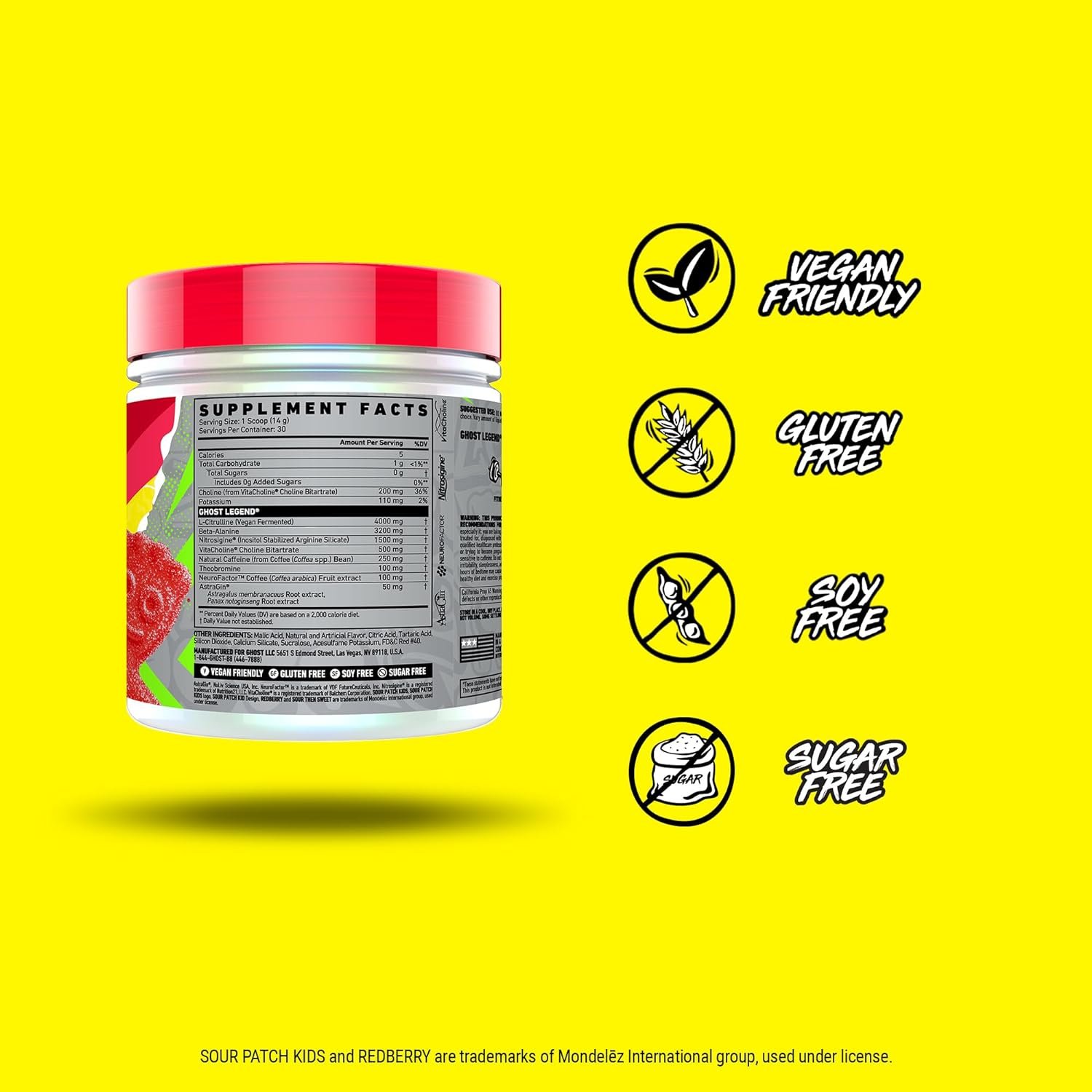 Legendary Pre-Workout: GHOST Legend V3 pre-workout combines a standout energy & focus formula with premium pump ingredients in the authentic SOUR PATCH KIDS REDBERRY flavor you know & love to get you feeling like a legend whenever you need it most. 1 scoop per serving, 30 servings per container.