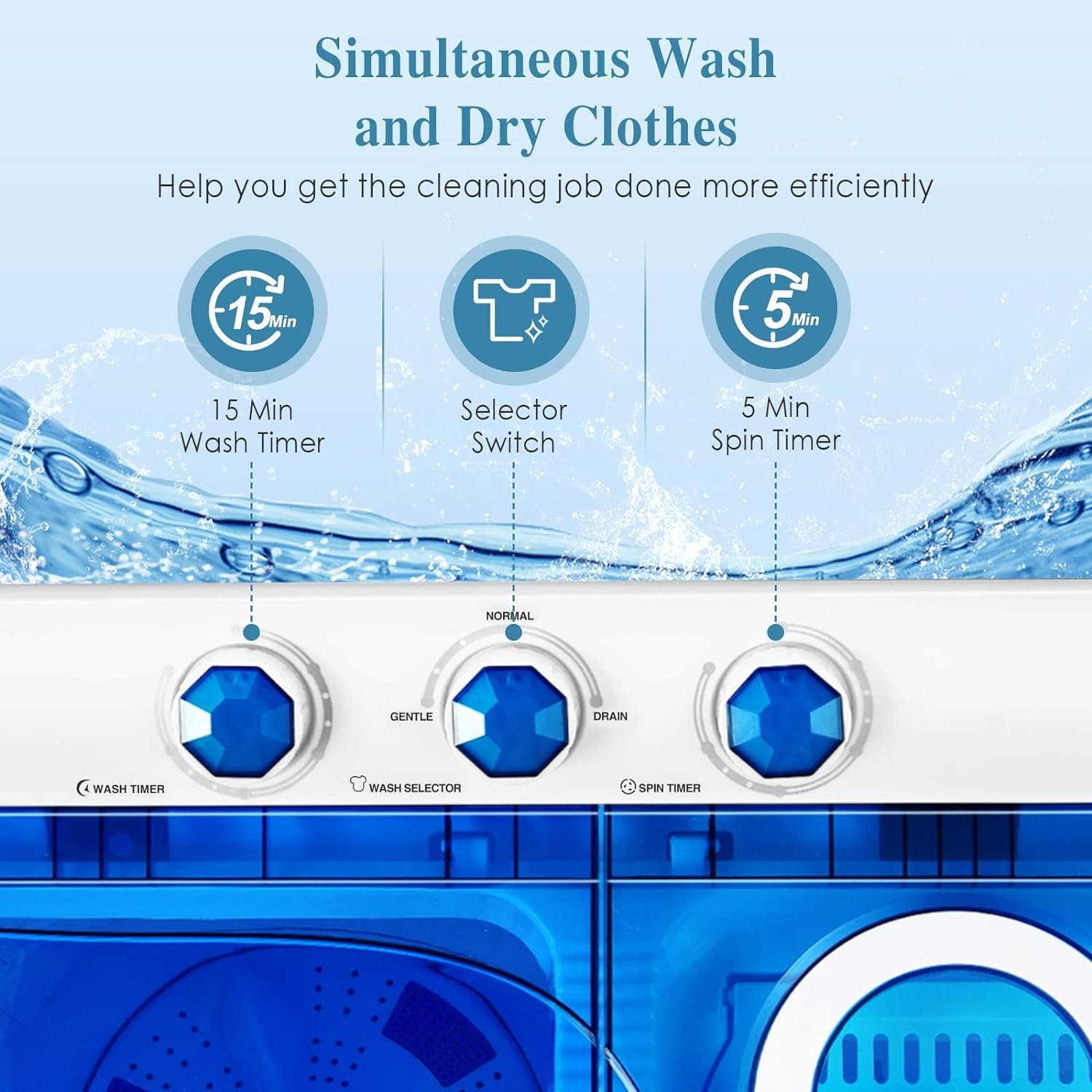 [Easy to Operate]: Control panel design is very simple as pictures shows. There are only 3 knobs for time setting and wash modes selections. Two washing modes Gentle and Normal are designed for different clothes types.