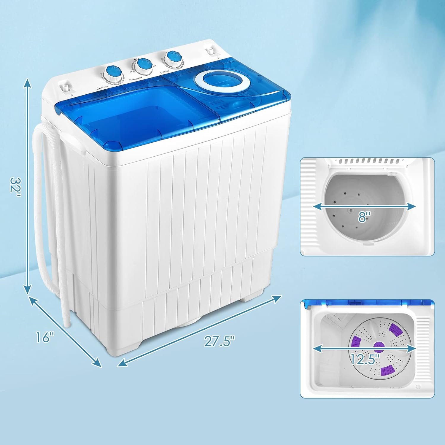 Material PP, ABS Rated Voltage 120V Rated Frequency 60 HZ Rated Input Power for Washing 280 W Rated Input Power for Spin 140 W Overall Dimension (Lid Closed) 27.5″ x 16″ x 32″ (L x W x H) Diameter of Washing Tub 12.5″ Diameter of Spin Tub 8″ Faucet Connection Diameter 1″ Length Of Drainage Pipe 53″ Length Of Inlet Pipe 45.5″ Capacity for Washing 18 lbs Capacity for Spin 8 lbs Net Weight 33.5 lbs Package Includes 1 x Twin Tub Washing Machine, 1 x Water Inlet Hose, 1 x User Guide