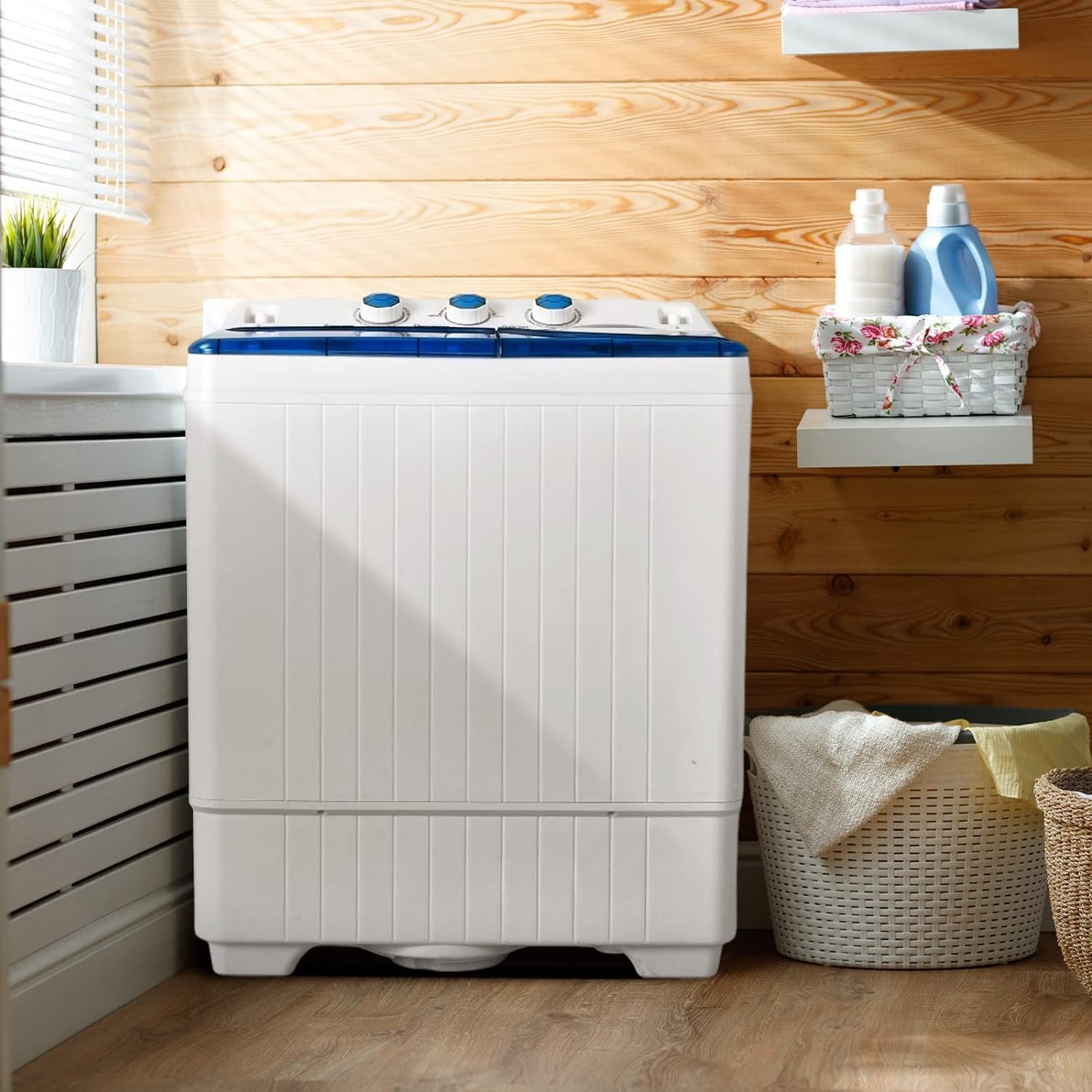 This washer and spinner combo features 2 independent tubs allowing you to wash and shake dry clothes at the same time or separately. The washing machine has large capacity with 18 lbs capacity for washing and 8lbs capacity for spinning. Coming with 2 powerful motors, the washing power can reach 280 W and the spinning power can reach 140 W. Clothes can be washed fast and clean. Besides, with 3 function switches which are gentle, normal and drain. You can also easily set washing time (0-15 minutes) or spinning time (0-5 minutes) based on laundry types. The good size makes the washer suitable for home, apartment, dormitory, RV and so on.