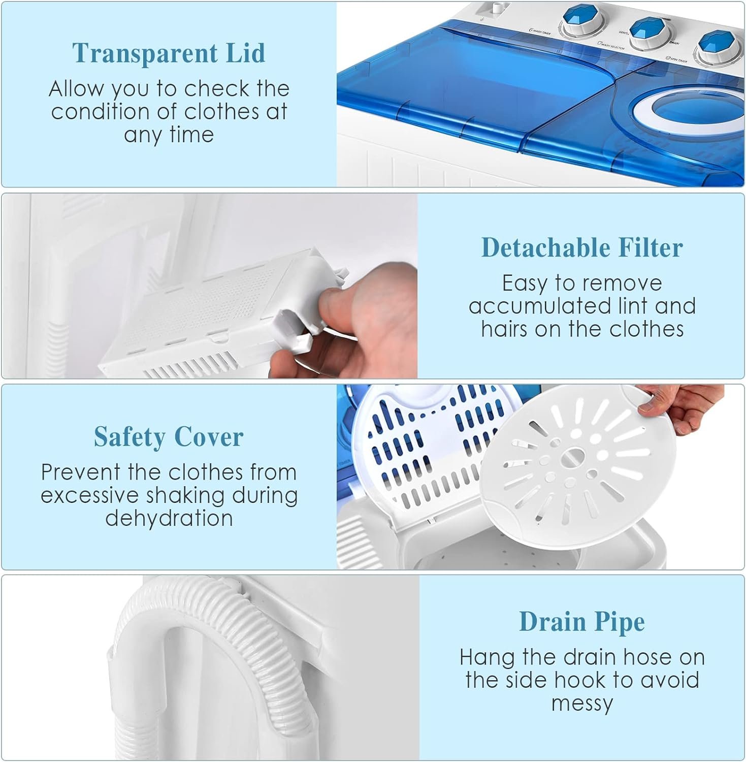 Dual motor for 280W washing power and 140 spinning powerWashing tub (18 lbs) and spinning tub (8 lbs) meet daily laundry needsSeparate washing and spinning functions can be controlled by different timer switchesInlet pipe for smooth water flowLint filter better collects lints in water