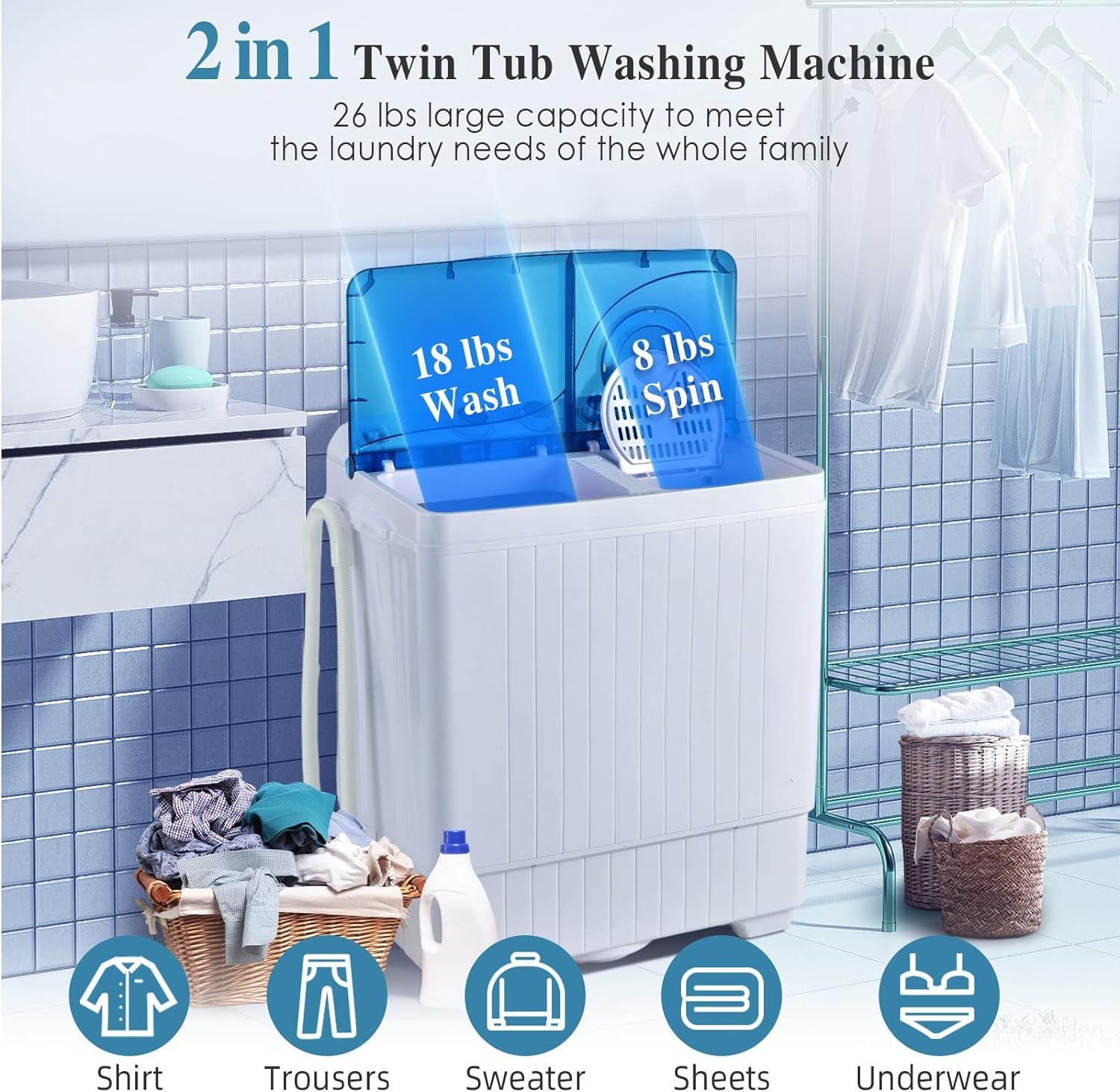 [Twin Tub Design]: (18 lbs) and the spinning tub (8 lbs). Two tubs of this washing machine can work together or separately as you need.