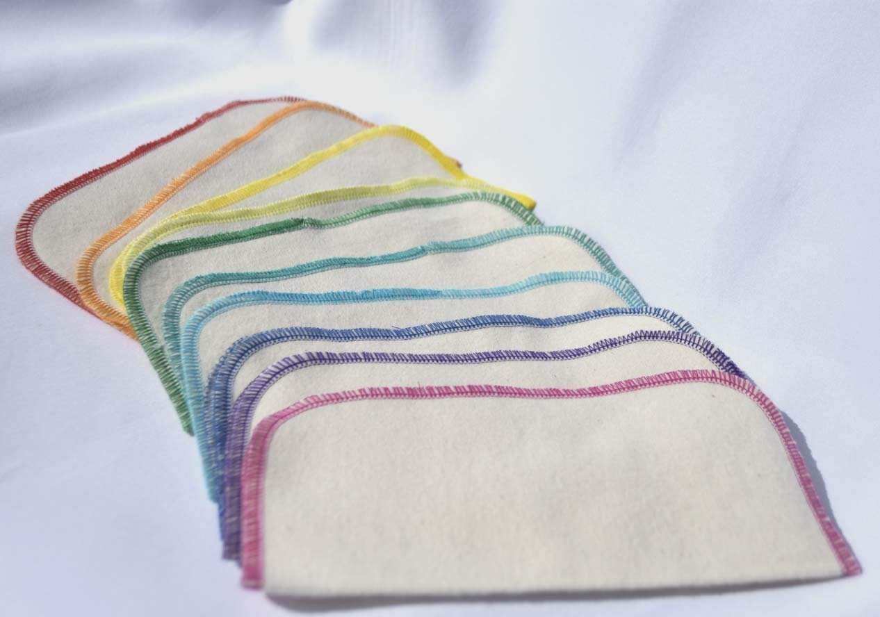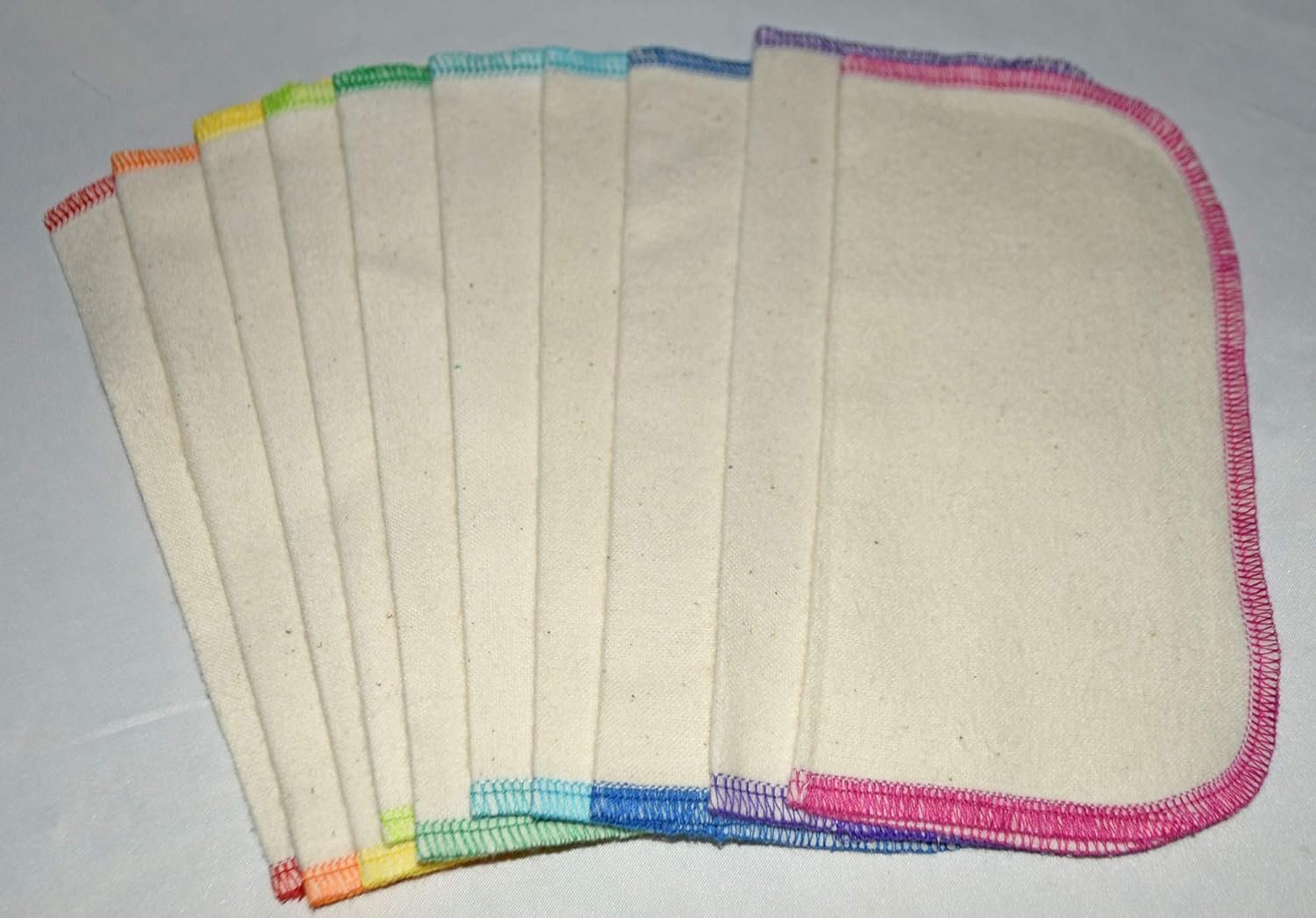 Stack of 10 eco-friendly alternative to paper towels, napkins, and throw away baby wipes. This is a great way to help eliminate trash, and an easy way to help the environment. These are made from Super Soft 2 layer of Organic 100% Cotton Flannel, and measure 8×8 inches. The Little Wipes are perfect for little hands, but are thirsty enough to dry big hands, too. Great for casual, every day napkins (and they won’t fall apart like paper napkins do). Nice and gentle enough for baby’s face or behind; and, a great thing to keep in your purse for messy emergencies when you are on the road. The Little Wipes are made from very nice, high quality 100% Organic cotton and are serged around the edges with long lasting, but very soft polyester thread for a clean finish. You can expect these work-horses to last for a very long time. Use them to mop up any spill, dry your hands, or for any typical use of paper towels. I throw mine in the washer and dryer with any and all loads of laundry (they take up very little space), because no special care is required. Organic Flannel is softer than the white or printed flannel, lasts longer, and is better for the environment. This organic fabric is very, very nice, super soft and perfect for a gift. Try them and love them, or send them back for a 100% refund. GOTS certified 100% organic cotton flannel. Natural, unbleached flannel fabric is from a certified Fair Trade Factory, and cut, sewn and finished here in the USA by Americans. This set is in stock, and ready to go.