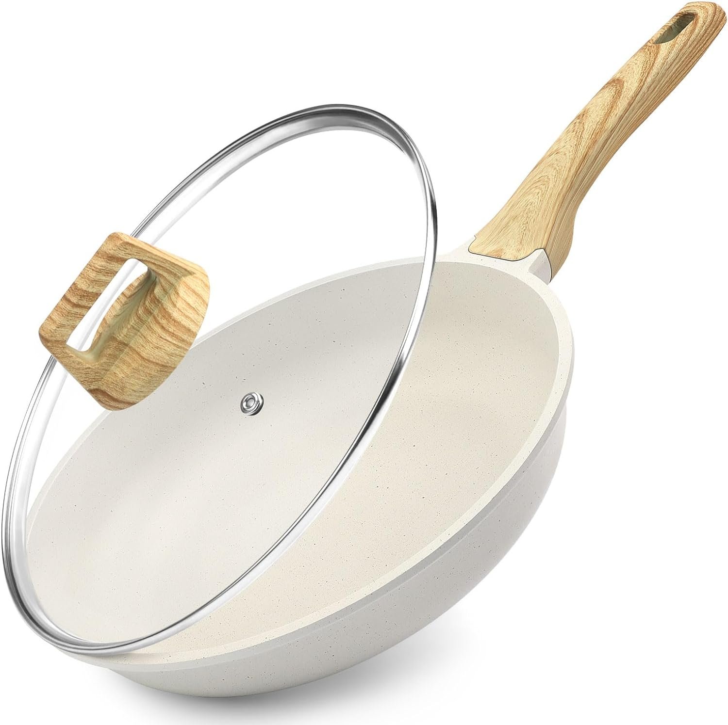 Ergonomic Handle & Glass Lid- The bakelite handle features woodgrain design. It is comfortable to grip and stays cool while cooking. High quality tempered glass lid makes it convenient to see the cooking status and limits splashes on your stove.