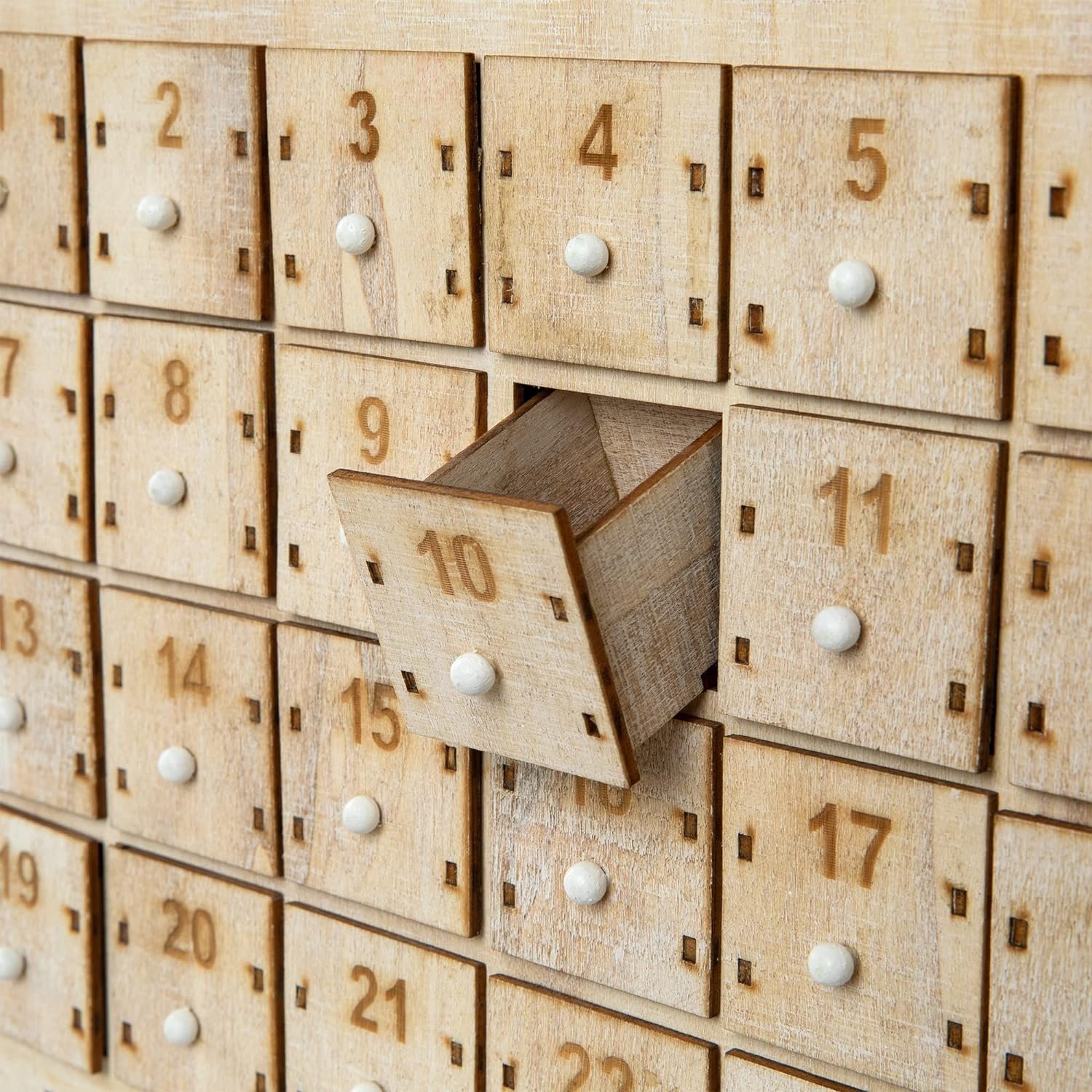 HANDCRAFTED: Crafted from sturdy MDF, this fantastic lighted Countdown to Christmas has 24 drawers. It measures 14”L X 3.5”W X 15.5”H. Each drawer measures 1.5” * 2” *1.75”