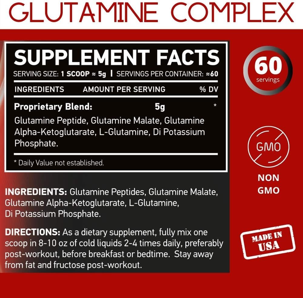Unique blend of FOUR types of glutamine: l-glutamine, glutamine peptides, l-glutamine akg and l-glutamine malate – Other Ingredients: NONE!