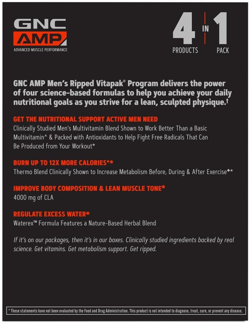 GNC AMP Men’s Ripped Vitapak Program Metabolism + Muscle Support: Men’s Multivitamin Blend GNC AMP Men’s Ripped Vitapak Program delivers the power of five science-based formulas to help you achieve your daily nutritional goals as you strive for a lean, sculpted physique. Contains a clinically studied men’s multivitamin blend shown to work better than a basic multivitamin & packed with antioxidants to help fight free radicals that can be produced from your workout