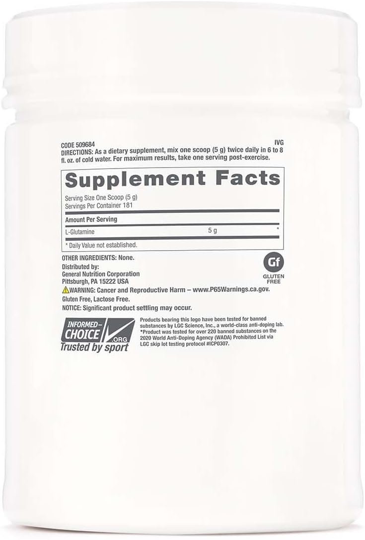 GNC Pro Performance L-Glutamine 5000 mg GNC Pro Performance L-Glutamine is a key amino acid for muscles. Supplementation may help maintain glutamine levels that have been depleted as a result of intense exercise. Glutamine is involved in protein synthesis and plays a pivotal role in the body’s nitrogen balance.ˆ It serves as a fuel for the immune system and maintenance of proper intestinal function. Tested and certified Banned Substance Free♦ Gluten and lactose free Mixes easily with your favorite beverage. ˆWhen used in conjunction with an exercise program.