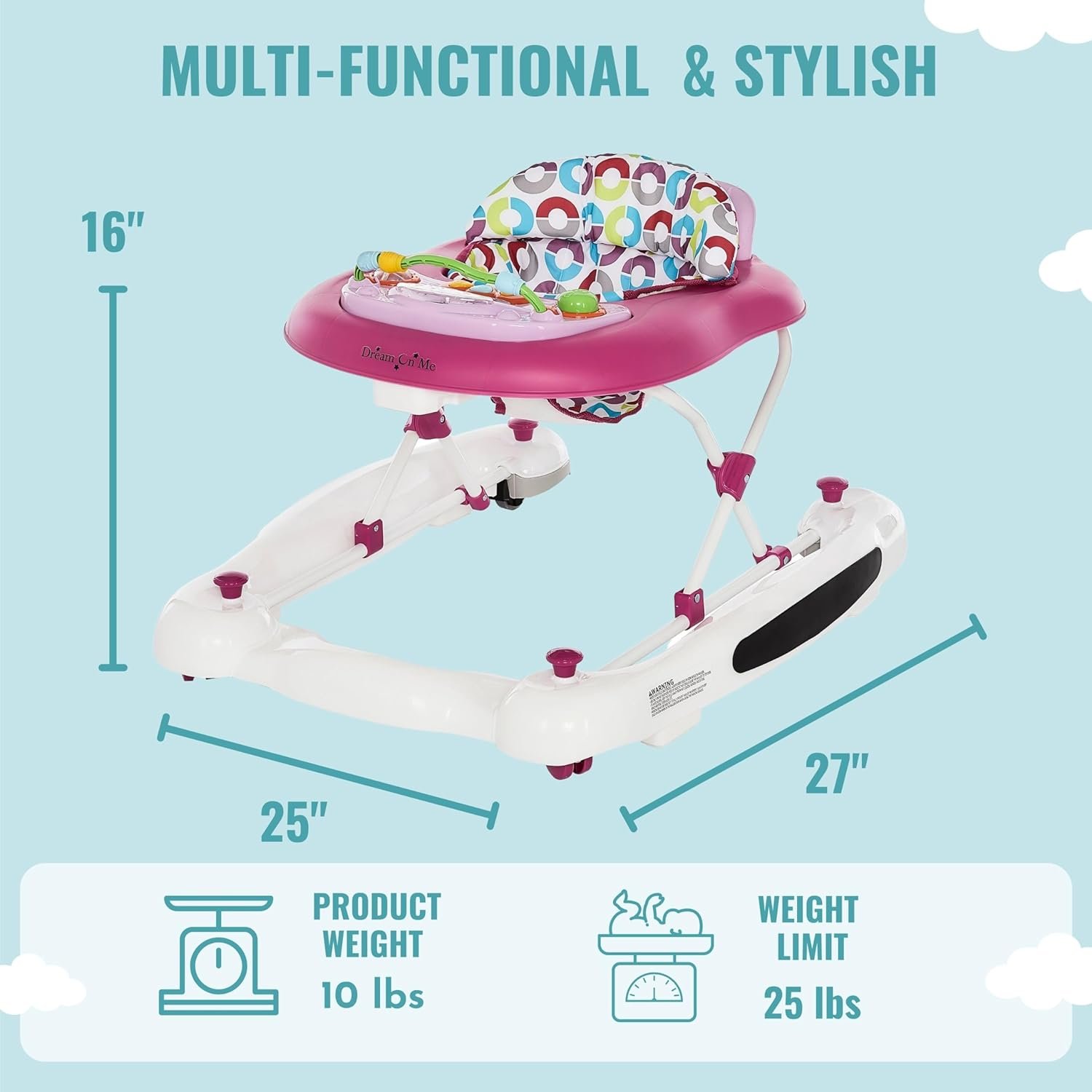 Help your baby discover walking with the Go Getter Walker. The seated walker is a great way to introduce your child to walking. As your LO gets confident, use it as a walk-behind walker – see them push it around the house! The Go Getter comes with attractive touches that your child will delight in. The bright multi-functional toy tray provides non-stop entertainment. It also comes with a removable snack tray for meals on the go! Your child will delight in the 3 attractive colors and trendy patterns that the Go Getter is available in. Other useful features include a comfortable high foam seat back which provides added support. The seat pad is conveniently machine-washable. The Go Getter features three height settings to keep pace with those growing strides It conforms to ASTM F977 Safety Standards. The independent front swivel wheels allow easy maneuvering and skid-resistant friction pads on base provide added safety. Product specs are 27L x 25 W x 16 H inches and it weighs 10.2lbs Wipe plastic parts with a damp cloth to clean.