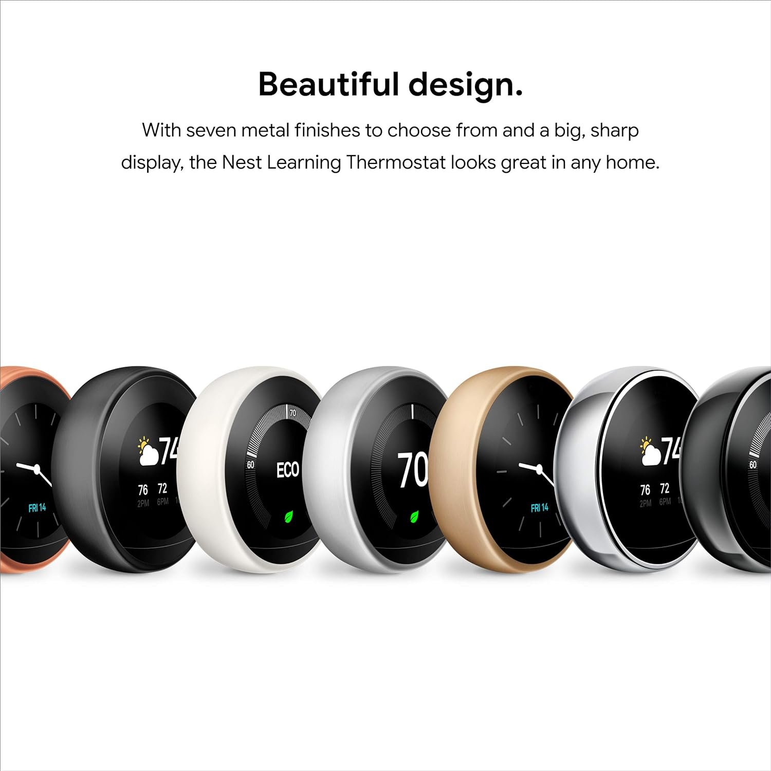 [1] Remote control and mobile notifications require working internet and Wi-Fi. [2] Alerts can notify you of a potential issue with eligible HVAC systems. They’re meant to provide helpful information, not an endorsement, representation, or warranty of any kind about the health of your HVAC system. Alerts aren’t intended to replace a diagnosis by a qualified HVAC professional. [3] Energy savings are not guaranteed and depend on energy usage, weather, and other factors. [4] Voice control requires a compatible device, and working internet and Wi-Fi. [5] Independent studies showed that Nest thermostats saved people an average of 10% to 12% on heating and 15% on cooling. Based on typical energy costs, we’ve estimated average savings of $131 to $145 a year. Individual savings are not guaranteed. [6]Nest Renew requires 3rd generation Nest Learning Thermostat, Nest Thermostat E, or the newest Nest Thermostat (sold separately), connected to a Google account. Only available in areas served by major continental US grids. Only available for customers on certain electric utility time-of-use rates. Learn more at support.google.com/googlenest/answer/11156316. [7]Adjustments only shift electricity usage from your heating and cooling.