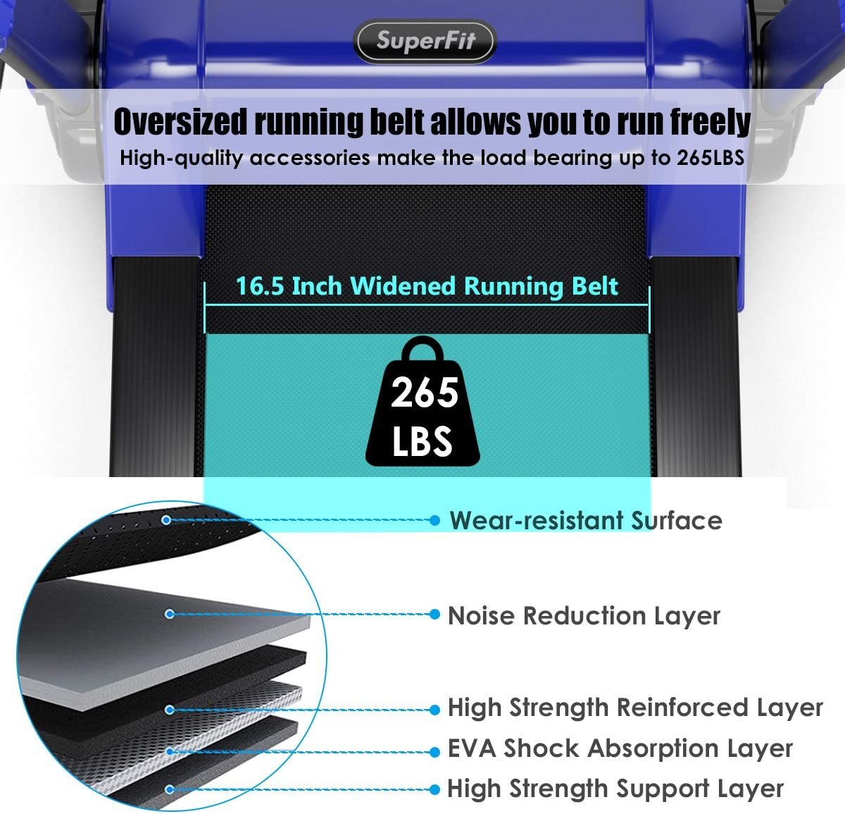 Widened Running Belt & Shock Reduction Foot Mat — Our 5-layer widened and shock-absorbing running belt can provide you with a spacious running area to help reduce the damage to knees and ankles. In addition, the rubber foot pads on the bottom can effectively reduce vibration, so you can enjoy sports without disturbing neighbors or family members.