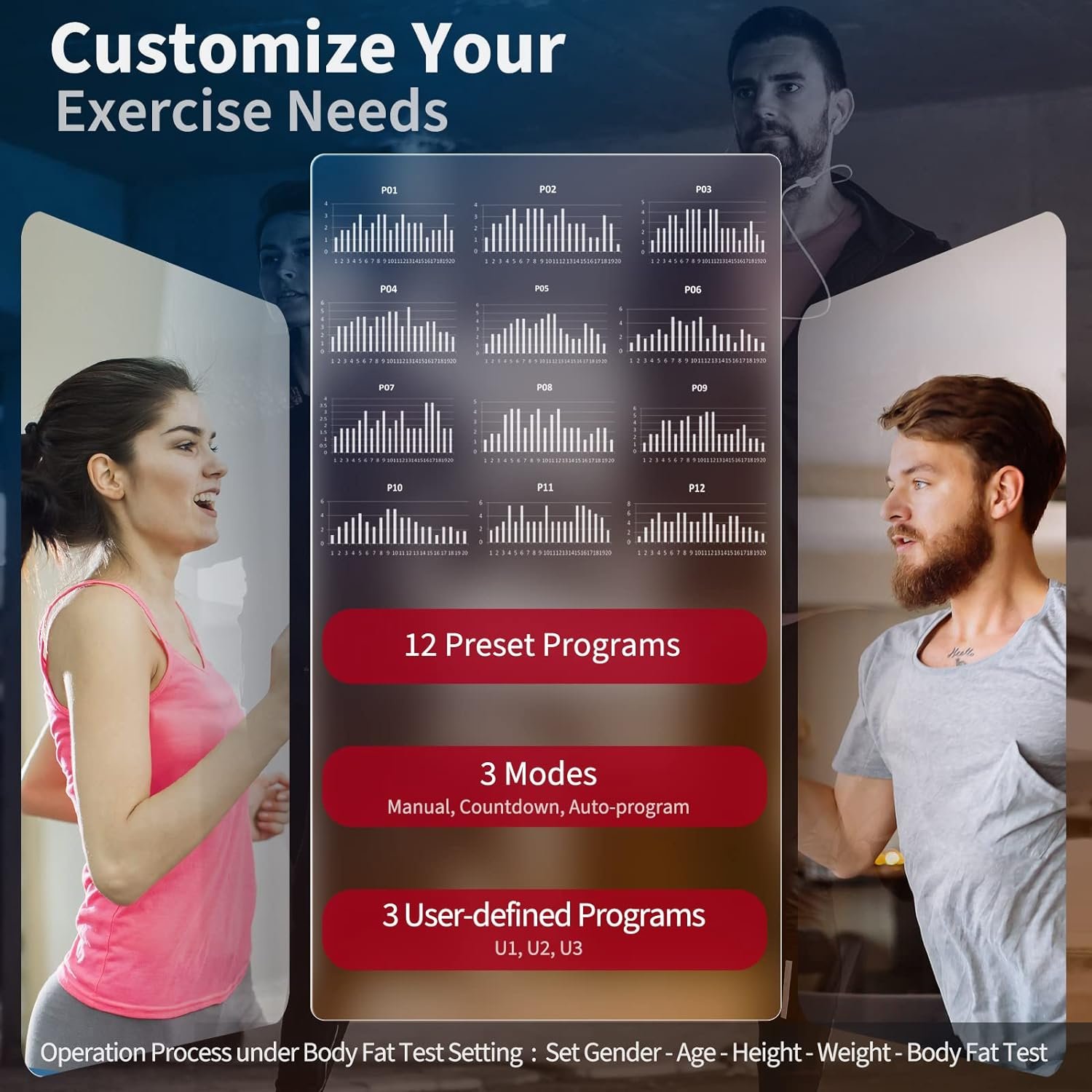 Customize Your Exercise Needs – This electric running machine features P1 – P2 preset programs, which allows you to consistently set higher, more intense exercise goals. Moreover, the 3 modes (manual, countdown, auto-program) and the 3 user-defined programs (customized time, distance, calorie consumption) provide more choices for you.