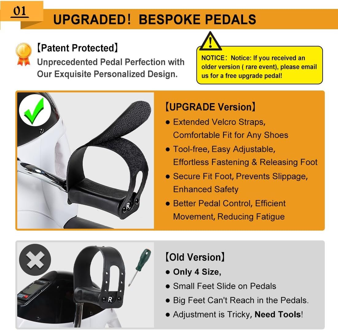 【SAFE & STABLE】The non-slip rubber pads keep the stationary pedal exerciser in place even at the maximum resistance level without scratching the floor. The non-slip surface of the ergonomic pedals increases friction and safety. Adjustable four-hole foot strap can flexibly adapt to different sizes of feet.