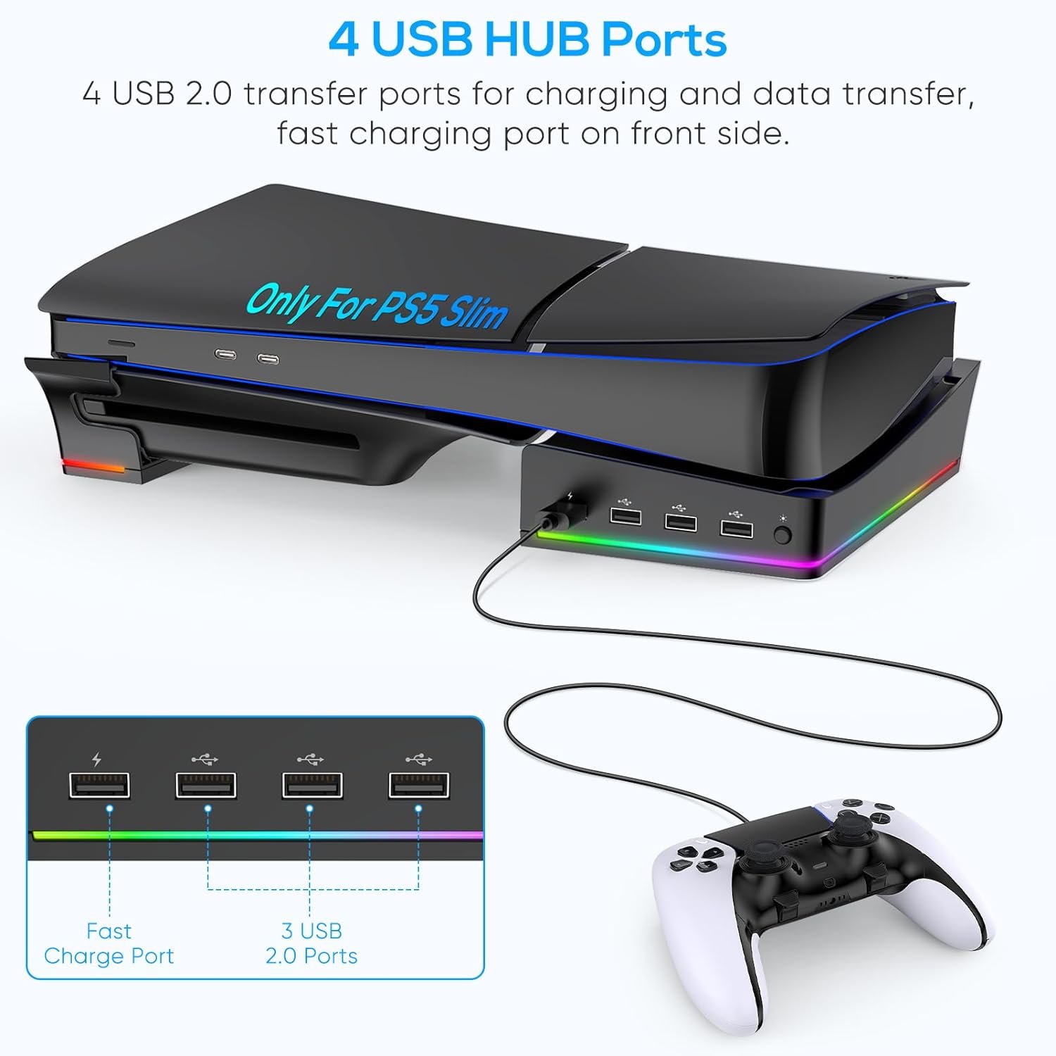 ⚡【Extra 4 USB Hub Expansion】 Featuring 1 Fast Charging Ports and 3 integrated USB HUB on the side, one of the USB ports with a charging icon can be used to fast charger for other accessories such as controllers, headphones etc. Another 3 USB ports are available for data transmission.✨Note: please connect rear USB port for PS5 Slim console to get always power supply (console and controllers are not included)