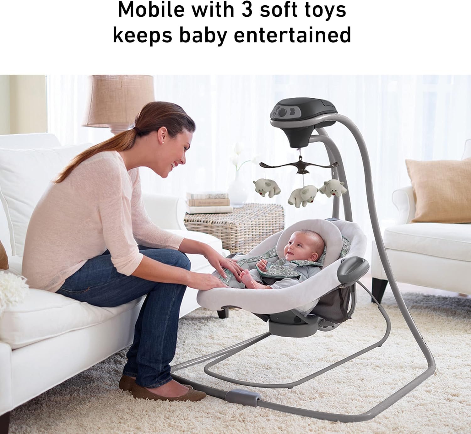 6 swinging speeds allow you to find the right pace; 2-speed vibration helps to soothe baby; 10 classic melodies and 5 nature sounds to delight and amuse; Mobile with 3 soft toys keeps baby entertained