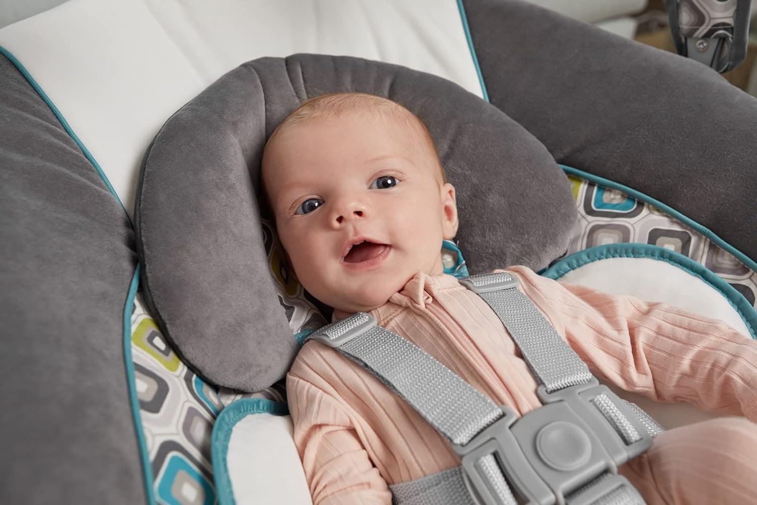 Roomy seat with plush head and body supports and adjustable recline for baby’s comfort