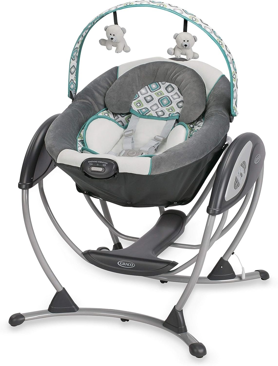 The Graco Glider LX Baby Swing is a unique gliding swing that soothes with the same gentle motion you use when cuddling and comforting baby in your nursery glider. The swing’s plush, roomy seat with removable infant head and body supports and adjustable recline keep baby cozy, while music keeps baby entertained. Additional features including adjustable gliding speeds, 2-speed vibration, and an overhead toybar help further soothe baby.