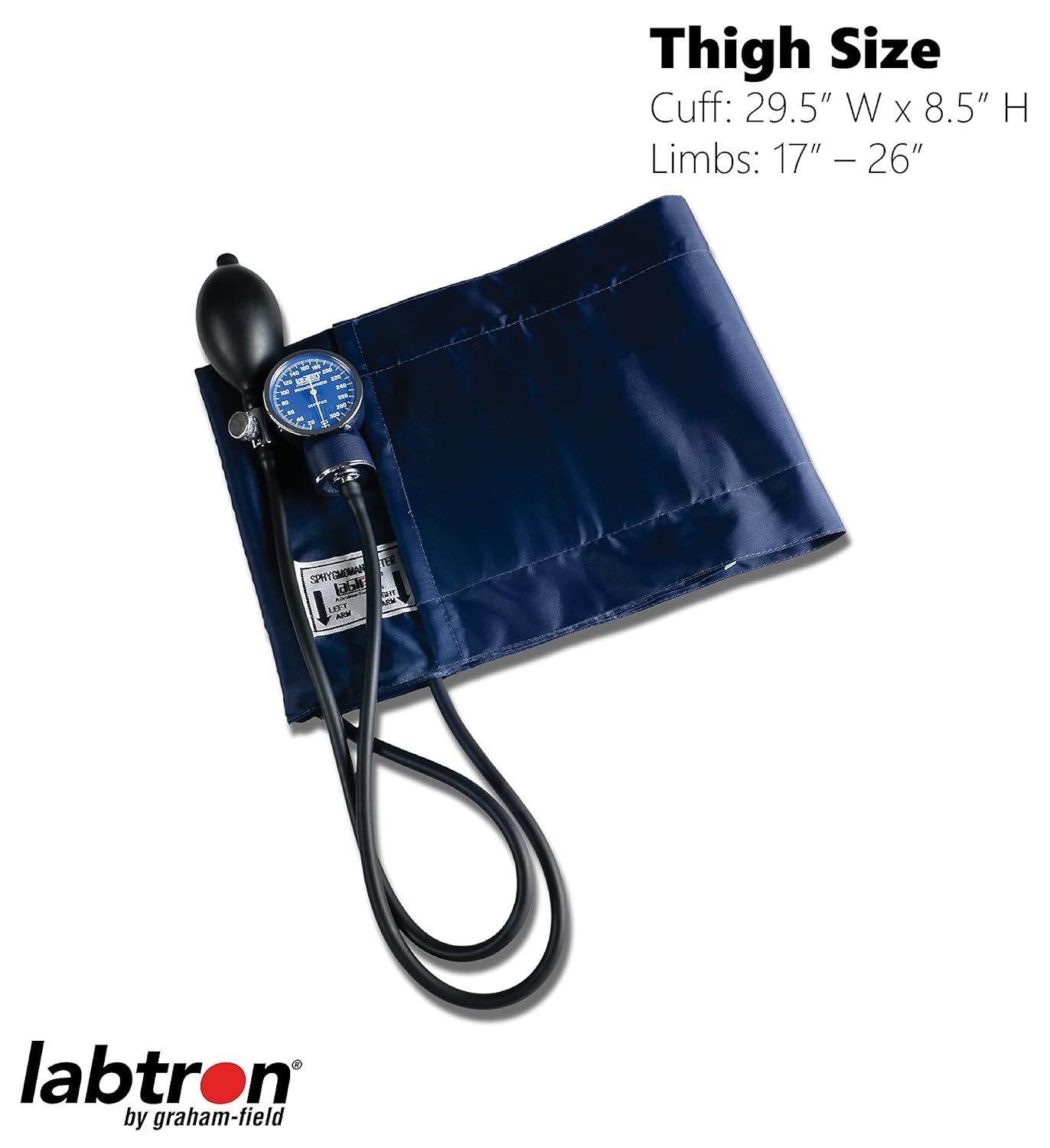 THIGH SIZE: XL size BP cuff measures 8.5 x 29.5″ (H x W), fitting limbs from 17 to 26″ in diameter; suitable for bariatric users and those with large arms